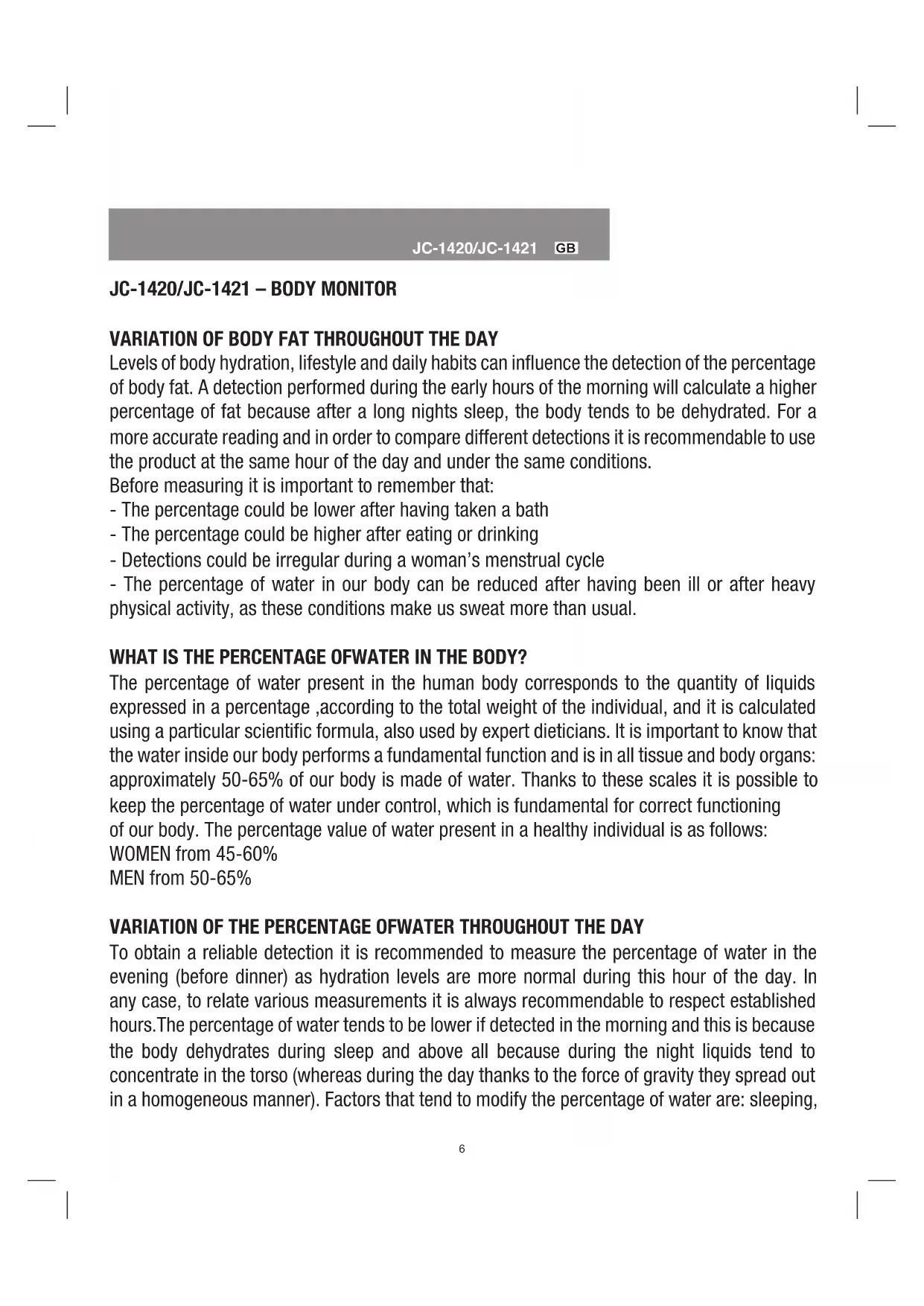 VARIATION OF BODY FAT THROUGHOUT THE DAY Levels of body hydration, lifestyle and daily habits can inuence the detection of the percentage of body fat. A detection performed during the early hours of the morning will calculate a higher percentage of fat because after a long nights sleep, the body tends to be dehydrated. For a more accurate reading and in order to compare different detections it is recommendable to use the product at the same hour of the day and under the same conditions. Before measuring it is important to remember that: - The percentage could be lower after having taken a bath - The percentage could be higher after eating or drinking - Detections could be irregular during a woman’s menstrual cycle - The percentage of water in our body can be reduced after having been ill or after heavy physical activity, as these conditions make us sweat more than usual. WHAT IS THE PERCENTAGE OFWATER IN THE BODY? The percentage of water present in the human body corresponds to the quantity of liquids expressed in a percentage ,according to the total weight of the individual, and it is calculated using a particular scientic formula, also used by expert dieticians. It is important to know that the water inside our body performs a fundamental function and is in all tissue and body organs: approximately 50-65% of our body is made of water. Thanks to these scales it is possible to keep the percentage of water under control, which is fundamental for correct functioning of our body. The percentage value of water present in a healthy individual is as follows: WOMEN from 45-60% MEN from 50-65% VARIATION OF THE PERCENTAGE OFWATER THROUGHOUT THE DAY To obtain a reliable detection it is recommended to measure the percentage of water in the evening (before dinner) as hydration levels are more normal during this hour of the day. In any case, to relate various measurements it is always recommendable to respect established hours.The percentage of water tends to be lower if detected in the morning and this is because the body dehydrates during sleep and above all because during the night liquids tend to concentrate in the torso (whereas during the day thanks to the force of gravity they spread out in a homogeneous manner). Factors that tend to modify the percentage of water are: sleeping,6
