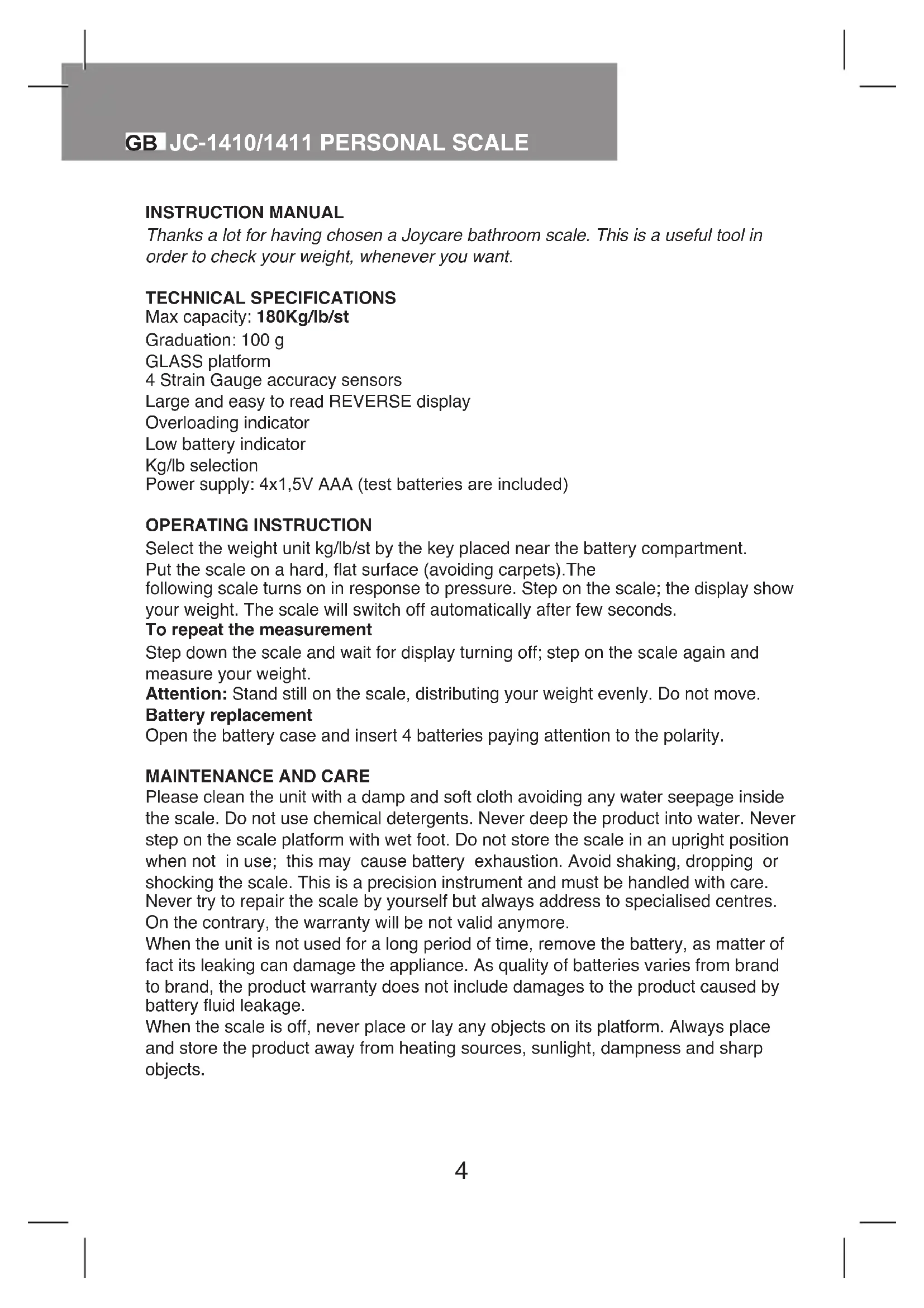 INSTRUCTION MANUAL Thanks a lot for having chosen a Joycare bathroom scale. This is a useful tool in order to check your weight, whenever you want. TECHNICAL SPECIFICATIONS Max capacity: 180Kg/lb/st Graduation: 100 g GLASS platform 4 Strain Gauge accuracy sensors Large and easy to read REVERSE display Overloading indicator Low battery indicator Kg/lb selection Power supply: 4x1,5V AAA (test batteries are included) OPERATING INSTRUCTION Select the weight unit kg/lb/st by the key placed near the battery compartment. Put the scale on a hard, at surface (avoiding carpets).The following scale turns on in response to pressure. Step on the scale; the display show your weight. The scale will switch off automatically after few seconds. To repeat the measurement Step down the scale and wait for display turning off; step on the scale again and measure your weight. Attention: Stand still on the scale, distributing your weight evenly. Do not move. Battery replacement Open the battery case and insert 4 batteries paying attention to the polarity.