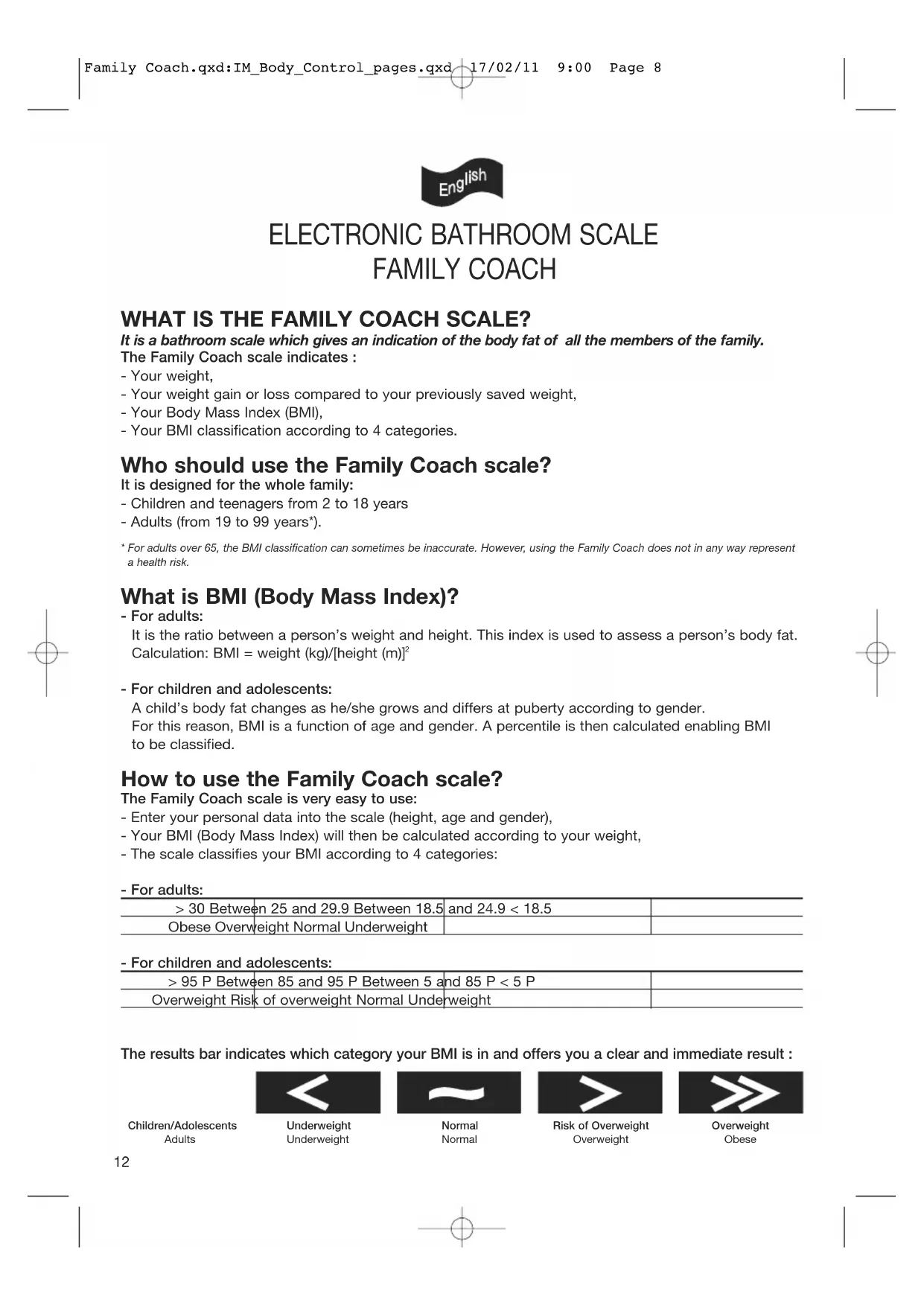 - For children and adolescents: A child’s body fat changes as he/she grows and differs at puberty according to gender. For this reason, BMI is a function of age and gender. A percentile is then calculated enabling BMI to be classified. How to use the Family Coach scale? The Family Coach scale is very easy to use: - Enter your personal data into the scale (height, age and gender), - Your BMI (Body Mass Index) will then be calculated according to your weight, - The scale classifies your BMI according to 4 categories: - For adults: > 30 Between 25 and 29.9 Between 18.5 and 24.9 < 18.5 Obese Overweight Normal Underweight - For children and adolescents: > 95 P Between 85 and 95 P Between 5 and 85 P < 5 P Overweight Risk of overweight Normal Underweight The results bar indicates which category your BMI is in and offers you a clear and immediate result : Underweight Underweight Normal Normal Risk of Overweight Overweight Overweight Obese Children/Adolescents Adults Family Coach.qxd:IM_Body_Control_pages.qxd 17/02/11 9:00 Page 8