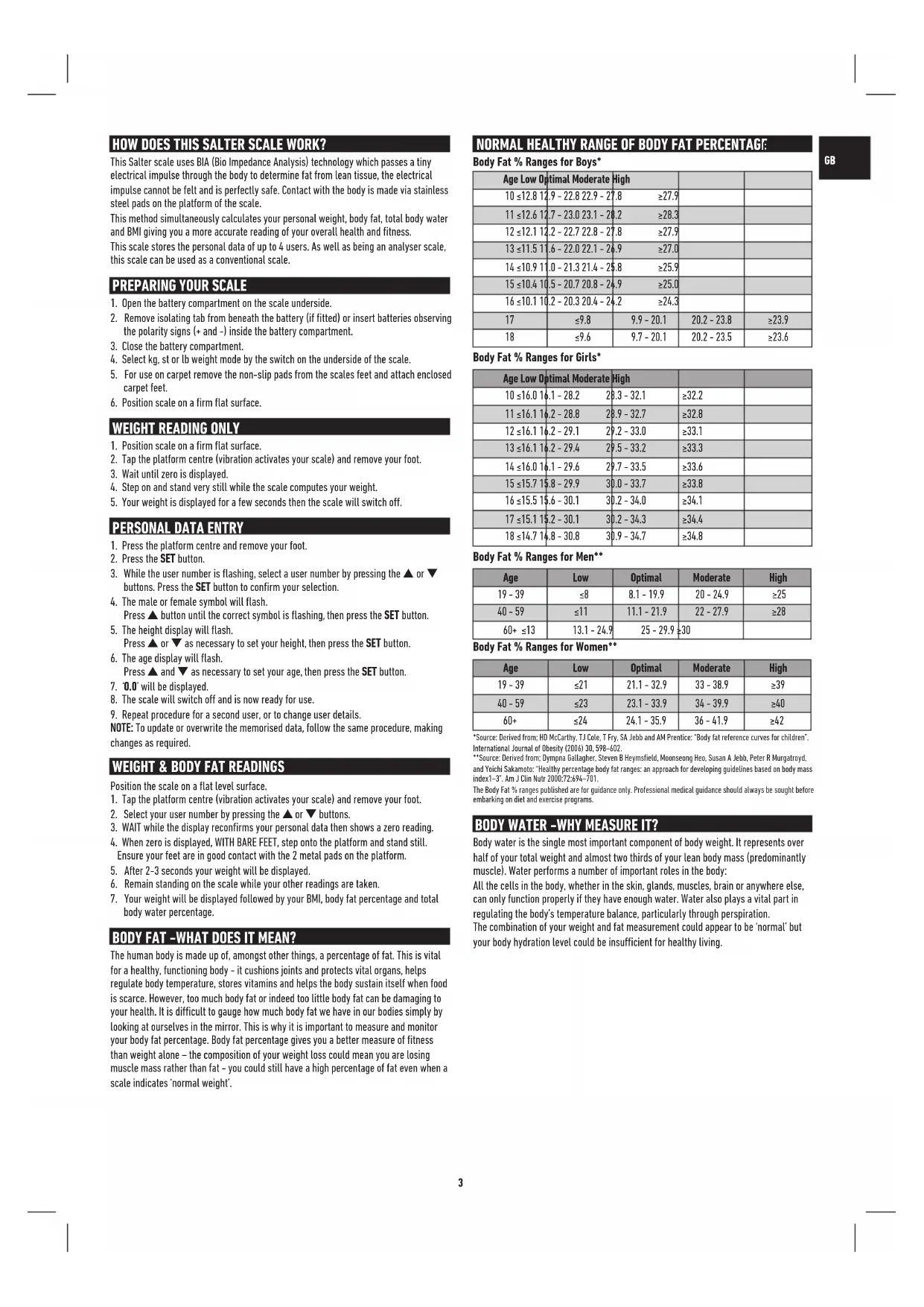 30+ Obese High IMPORTANT: If the chart/table shows that you are outside of a ‘normal’ healthy weight range, consult your doctor before taking any action. BMI classifications are for adults (age 20+ years) only. QUESTIONS & ANSWERS How exactly is my body fat and water being measured? This Salter Scale uses a measurement method known as Bioelectrical Impedance Analysis (BIA). A minute current is sent through your body, via your feet and legs. This current flows easily through the lean muscular tissue, which has a high fluid content, but not easily through fat. Therefore, by measuring your body’s impedance (i.e. its resistance to the current), the quantity of muscle can be determined. From this, the quantity of fat and water can then be estimated. What is the value of the current passing through me when the measurement is taken? Is it safe? The current is less than 1mA, which is tiny and perfectly safe. You will not be able to feel it. Please note however, that this device should not be used by anyone with an internal electronic medical device, such as a pacemaker, as a precaution against disruption to that device. If I measure my body fat and water at dierent times during the day, it can vary quite considerably. Which value is correct? Your body fat percentage reading varies with body water content, and the latter changes throughout the course of the day. There is no right or wrong time of the day to take a reading, but aim to take measurements at a regular time when you consider your body to be normally hydrated. Avoid taking readings after having a bath or sauna, following intensive exercise, or within 1-2 hours of drinking in quantity or eating a meal. My friend has a Body Fat Analyser made by another manufacturer. When I used it I found that I got a dierent body fat reading. Why is this? Dierent Body Fat Analysers take measurements around dierent parts of the body and use dierent mathematic algorithms to calculate the percentage of body fat. The best advice is to not make comparisons from one device to another, but to use the same device each time to monitor any change. How do I interpret my body fat and water percentage readings? Please refer to the Body Fat and Water tables included with the product. They will guide you as to whether your body fat and water reading falls into a healthy category (relative to your age and sex). What should I do if my body fat reading is very ‘high? A sensible diet, fluid intake and exercise program can reduce your body fat percentage. Professional medical guidance should always be sought before embarking on such a program. Why are the body fat percentage ranges for men and women so dierent? Women naturally carry a higher percentage of fat than men, because the make-up of the body is dierent being geared towards pregnancy, breastfeeding etc. What should I do if my water percentage reading is ‘low’? Ensure that you are regularly taking sucient water and work towards moving your fat percentage into the healthy range. Why should I avoid using the Body Analyser Scale whilst pregnant? During pregnancy a woman’s body composition changes considerably in order to support the developing child. Under these circumstances, body fat percentage readings could be inaccurate and misleading. Pregnant women should therefore only use the weight function.