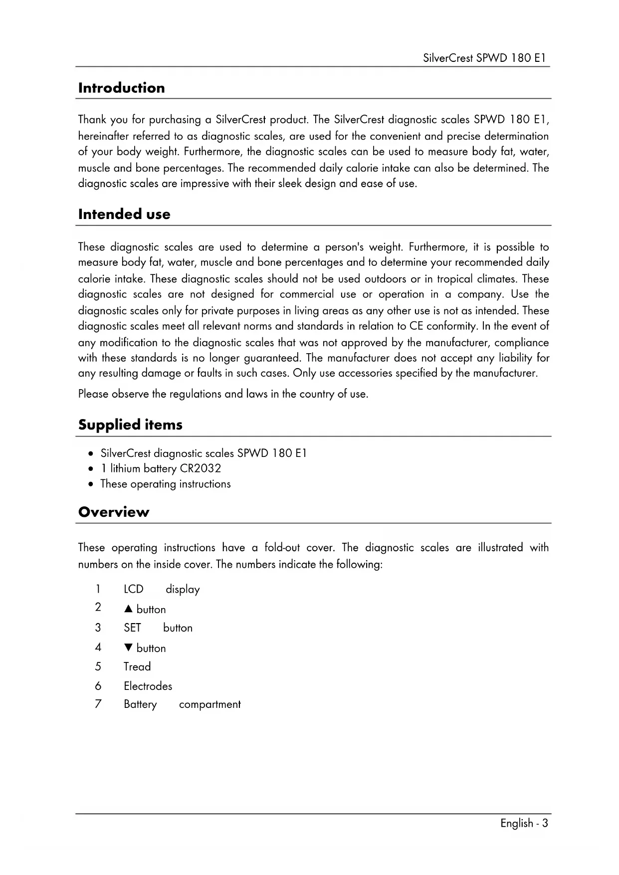 - Warranty and servicing advice SilverCrest SPWD 180 E1 English - 3 Introduction Thank you for purchasing a SilverCrest product. The SilverCrest diagnostic scales SPWD 180 E1, hereinafter referred to as diagnostic scales, are used for the convenient and precise determination of your body weight. Furthermore, the diagnostic scales can be used to measure body fat, water, muscle and bone percentages. The recommended daily calorie intake can also be determined. The diagnostic scales are impressive with their sleek design and ease of use. Intended use These diagnostic scales are used to determine a person's weight. Furthermore, it is possible to measure body fat, water, muscle and bone percentages and to determine your recommended daily calorie intake. These diagnostic scales should not be used outdoors or in tropical climates. These diagnostic scales are not designed for commercial use or operation in a company. Use the diagnostic scales only for private purposes in living areas as any other use is not as intended. These diagnostic scales meet all relevant norms and standards in relation to CE conformity. In the event of any modification to the diagnostic scales that was not approved by the manufacturer, compliance with these standards is no longer guaranteed. The manufacturer does not accept any liability for any resulting damage or faults in such cases. Only use accessories specified by the manufacturer. Please observe the regulations and laws in the country of use. Supplied items SilverCrest diagnostic scales SPWD 180 E1 1 lithium battery CR2032 These operating instructions Overview These operating instructions have a fold-out cover. The diagnostic scales are illustrated with numbers on the inside cover. The numbers indicate the following: 1 LCD display p. 14