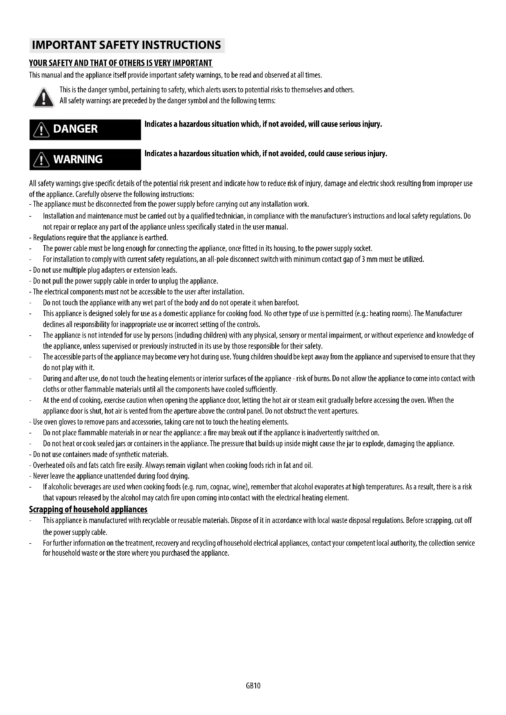 This is the danger symbol, pertaining to safety, which alerts users to potential risks to themselves and others. All safety warnings are preceded by the danger symbol and the following terms: DANGER Indicates a hazardous situation which, if not avoided, will cause serious injury. WARNING Indicates a hazardous situation which, if not avoided, could cause serious injury.GB11 After unpacking the oven, be sure that it has not been damaged during transport and that the oven door closes properly. In the event of problems, contact the dealer or your nearest After-sales Service. To avoid any damage, only remove the oven from its polystyrene foam base at the time of installation.