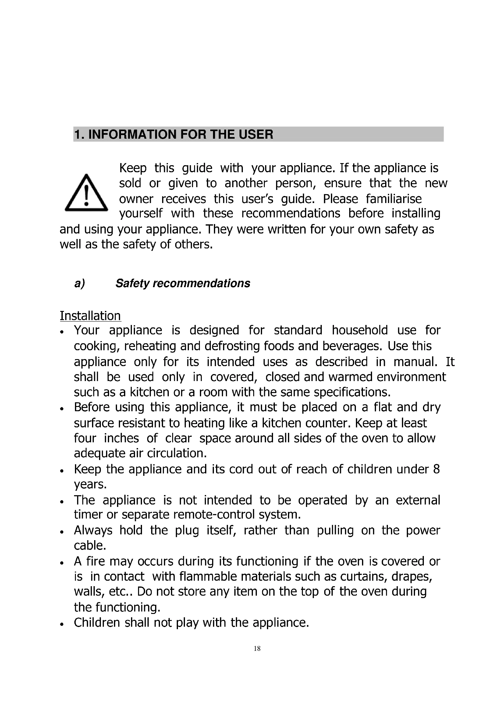 Keep this guide with your appliance. If the appliance is sold or given to another person, ensure that the new owner receives this user’s guide. Please familiarise yourself with these recommendations before installing and using your appliance. They were written for your own safety as well as the safety of others. a) Safety recommendations Installation