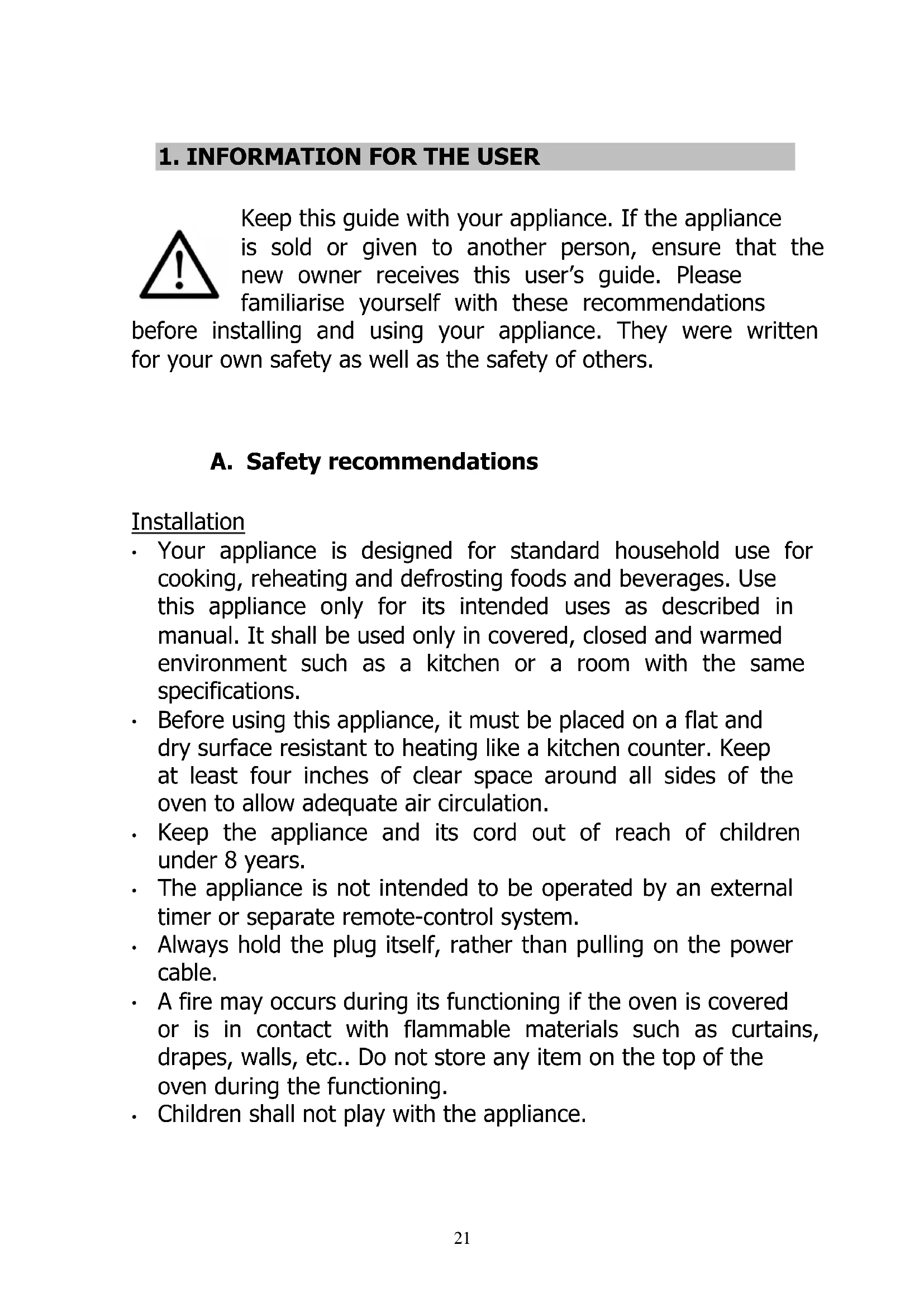 Keep this guide with your appliance. If the appliance is sold or given to another person, ensure that the new owner receives this user’s guide. Please familiarise yourself with these recommendations before installing and using your appliance. They were written for your own safety as well as the safety of others.