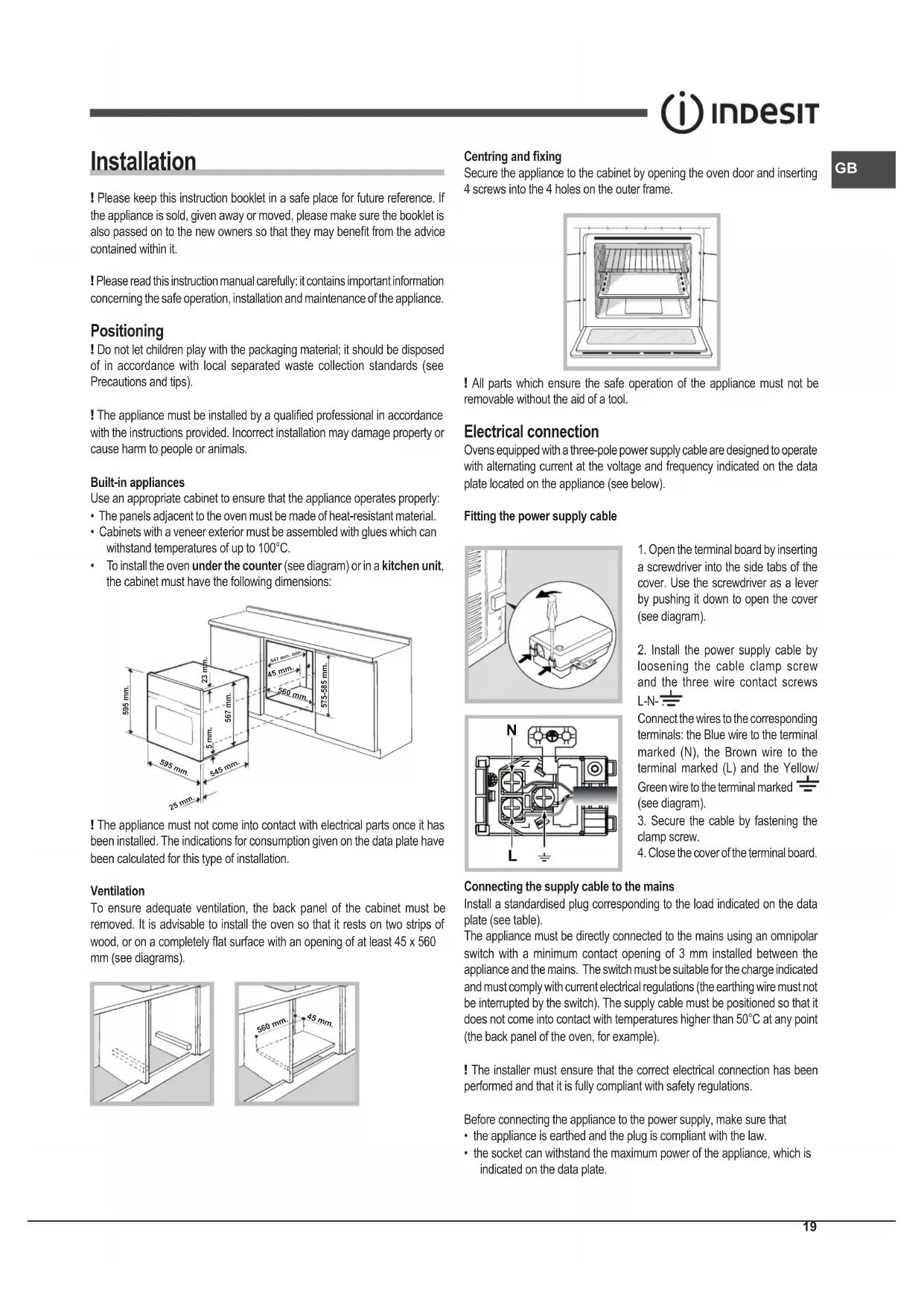 - To install the oven under the counter (see diagram) or in a kitchen unit, the cabinet must have the following dimensions: 595 mm.595 mm.25 mm.545 mm.5 mm.567 mm.23 mm.575-585 mm.45 mm.560 mm. 547 mm. min. ! The appliance must not come into contact with electrical parts once it has been installed. The indications for consumption given on the data plate have been calculated for this type of installation. Ventilation To ensure adequate ventilation, the back panel of the cabinet must be removed. It is advisable to install the oven so that it rests on two strips of wood, or on a completely at surface with an opening of at least 45 x 560 mm (see diagrams). 560 mm. 45 mm. Centring and xing Secure the appliance to the cabinet by opening the oven door and inserting 4 screws into the 4 holes on the outer frame. ! All parts which ensure the safe operation of the appliance must not be removable without the aid of a tool. Electrical connection Ovens equipped with a three-pole power supply cable are designed to operate with alternating current at the voltage and frequency indicated on the data plate located on the appliance (see below). Fitting the power supply cable