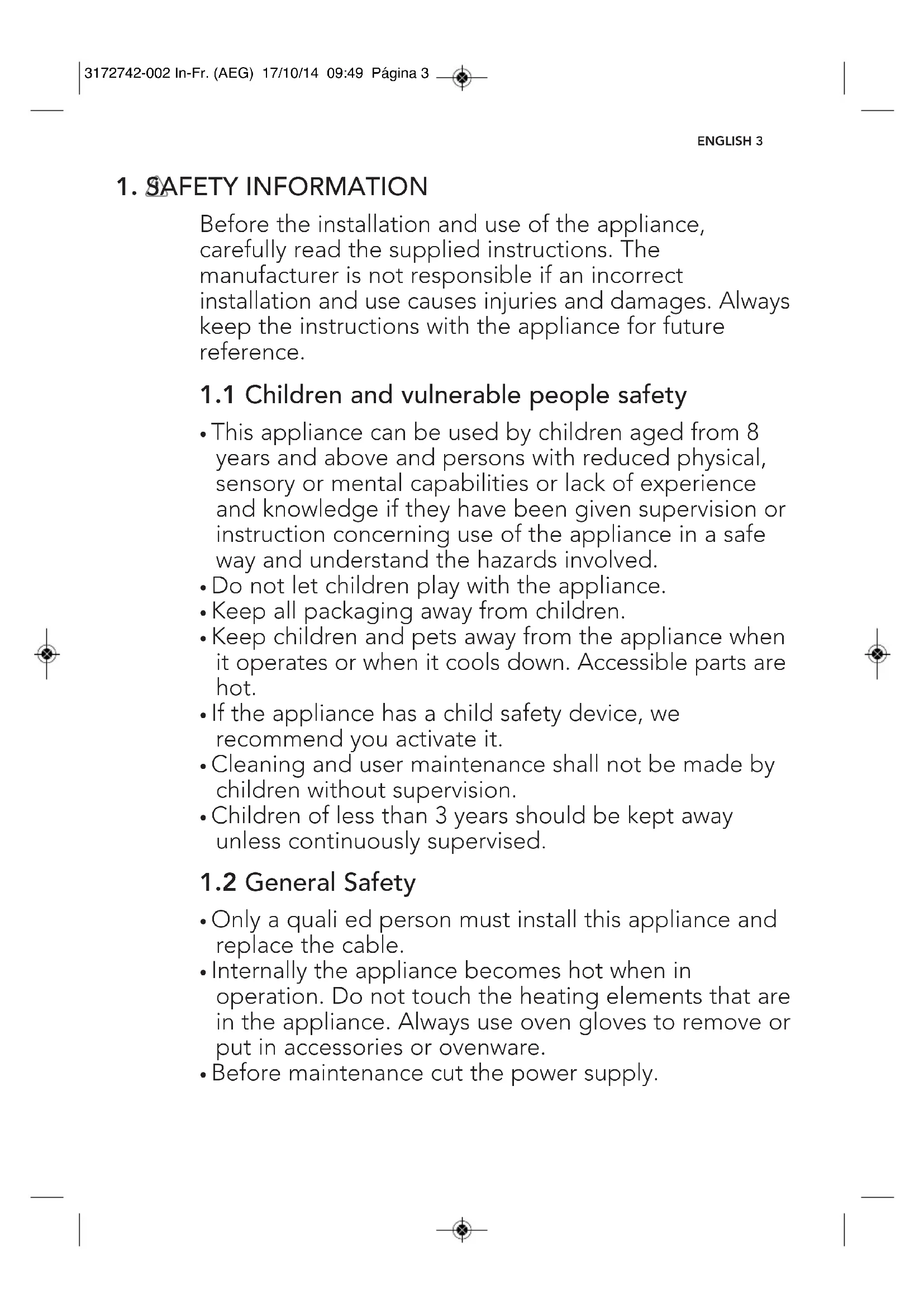 We recommend the use of original spare parts. When contacting Service, ensure that you have the following data available. The information can be found on the rating plate. model, PNC, Serial Number. Warning / Caution-Safety information General information and tips Environmental information Subject to change without notice. 3172742-002 In-Fr. (AEG) 17/10/14 09:49 Página 21. SAFETY INFORMATION ENGLISH 3 Before the installation and use of the appliance, carefully read the supplied instructions. The manufacturer is not responsible if an incorrect installation and use causes injuries and damages. Always keep the instructions with the appliance for future reference.