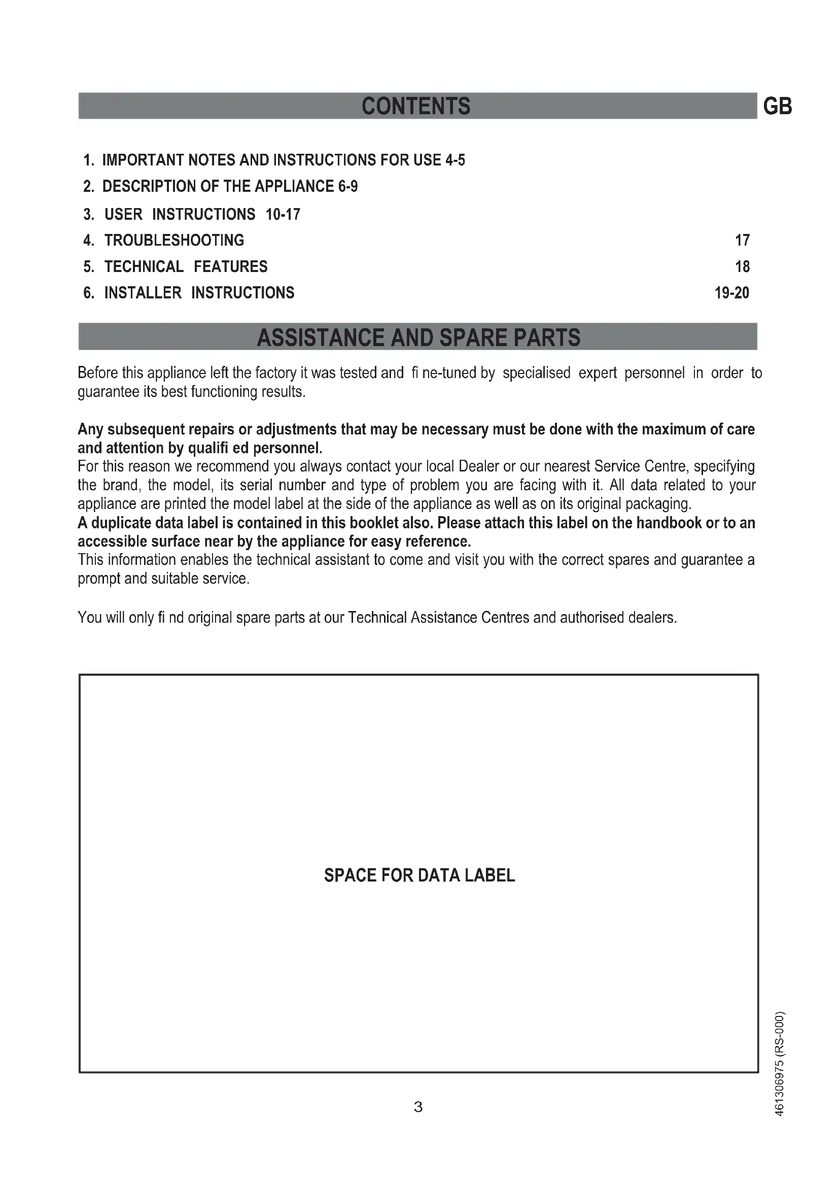 Before this appliance left the factory it was tested and fi ne-tuned by specialised expert personnel in order to guarantee its best functioning results. Any subsequent repairs or adjustments that may be necessary must be done with the maximum of care and attention by qualifi ed personnel. For this reason we recommend you always contact your local Dealer or our nearest Service Centre, specifying the brand, the model, its serial number and type of problem you are facing with it. All data related to your appliance are printed the model label at the side of the appliance as well as on its original packaging. A duplicate data label is contained in this booklet also. Please attach this label on the handbook or to an accessible surface near by the appliance for easy reference. This information enables the technical assistant to come and visit you with the correct spares and guarantee a prompt and suitable service. You will only fi nd original spare parts at our Technical Assistance Centres and authorised dealers.