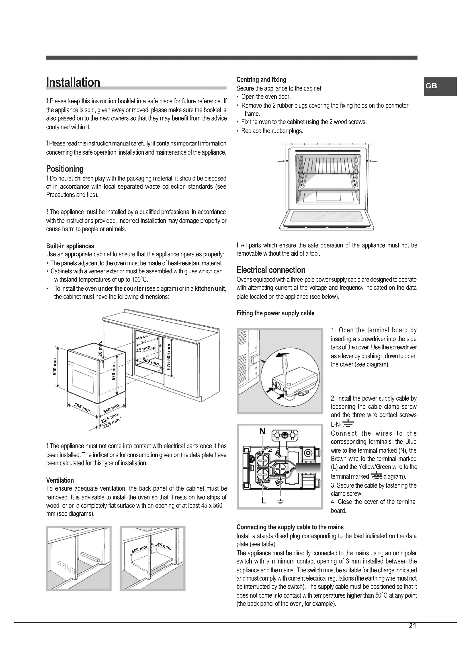 - To install the oven under the counter (see diagram) or in a kitchen unit, the cabinet must have the following dimensions: 590 mm. 595 mm.22,5 mm.*20,5 mm.550 mm.570 mm.20 mm.575-585 mm.45 mm.560 mm. 550 mm. min. ! The appliance must not come into contact with electrical parts once it has been installed. The indications for consumption given on the data plate have been calculated for this type of installation. Ventilation To ensure adequate ventilation, the back panel of the cabinet must be removed. It is advisable to install the oven so that it rests on two strips of wood, or on a completely at surface with an opening of at least 45 x 560 mm (see diagrams). 560 mm. 45 mm. Centring and xing Secure the appliance to the cabinet: