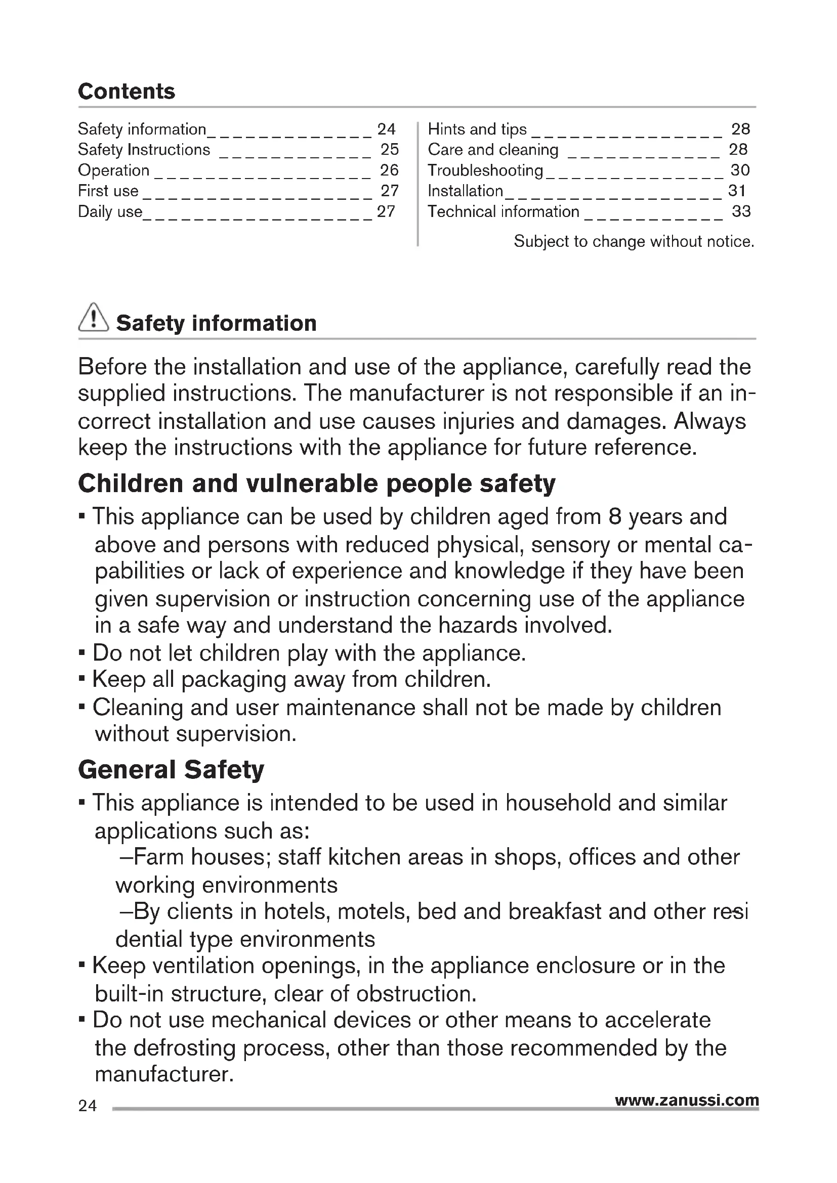 - Do not use mechanical devices or other means to accelerate the defrosting process, other than those recommended by the manufacturer. Safety information _____________ 24 Safety Instructions ____________ 25 Operation _________________ 26 First use __________________ 27 Daily use __________________ 27 Hints and tips _______________ 28 Care and cleaning ____________ 28 Troubleshooting ______________ 30 Installation _________________ 31 Technical information ___________ 3325 www.zanussi.com