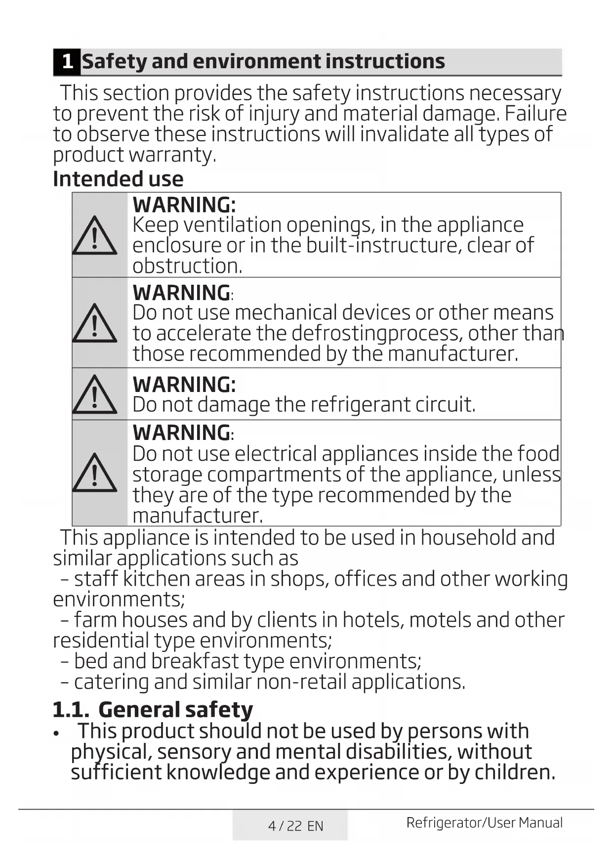 - Protecting the plastic surfaces 7 Troubleshooting 194 / 22 EN Refrigerator/User Manual 1 Safety and environment instructions This section provides the safety instructions necessary to prevent the risk of injury and material damage. Failure to observe these instructions will invalidate all types of product warranty. Intended use p. 18
