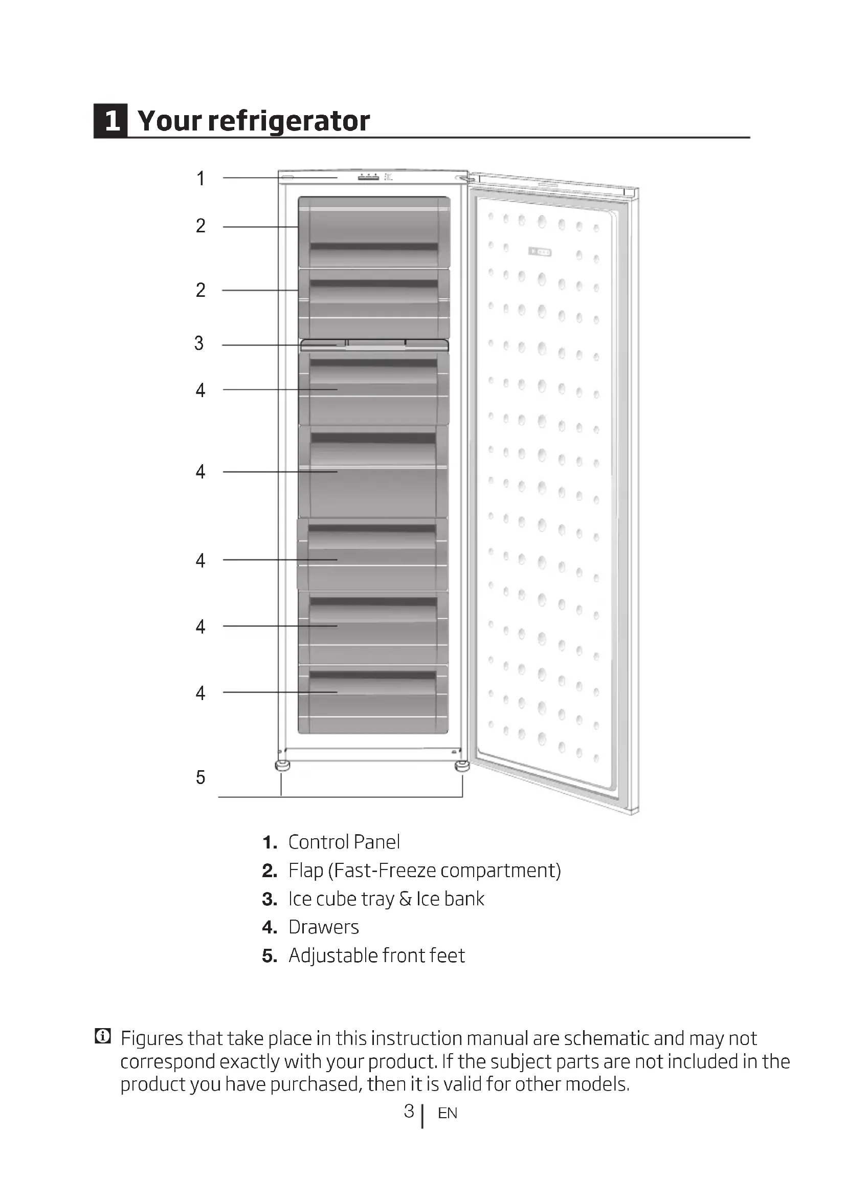 - The operating performance of the refrigerator may change due to the changes in the ambient temperature. It is normal and not a fault.EN
