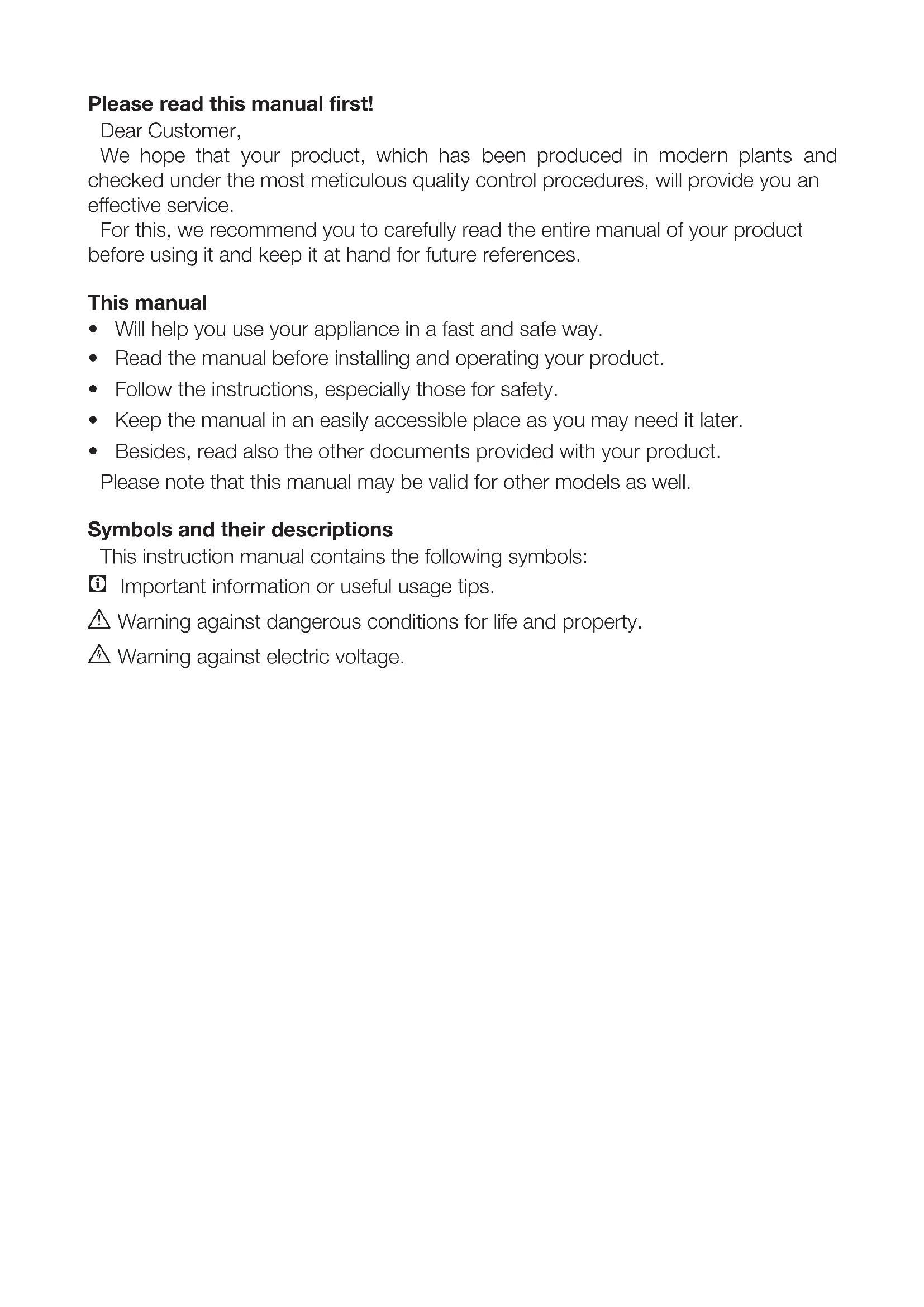 - Besides, read also the other documents provided with your product. Please note that this manual may be valid for other models as well. Symbols and their descriptions This instruction manual contains the following symbols: C Important information or useful usage tips. A Warning against dangerous conditions for life and property. B Warning against electric voltage.EN