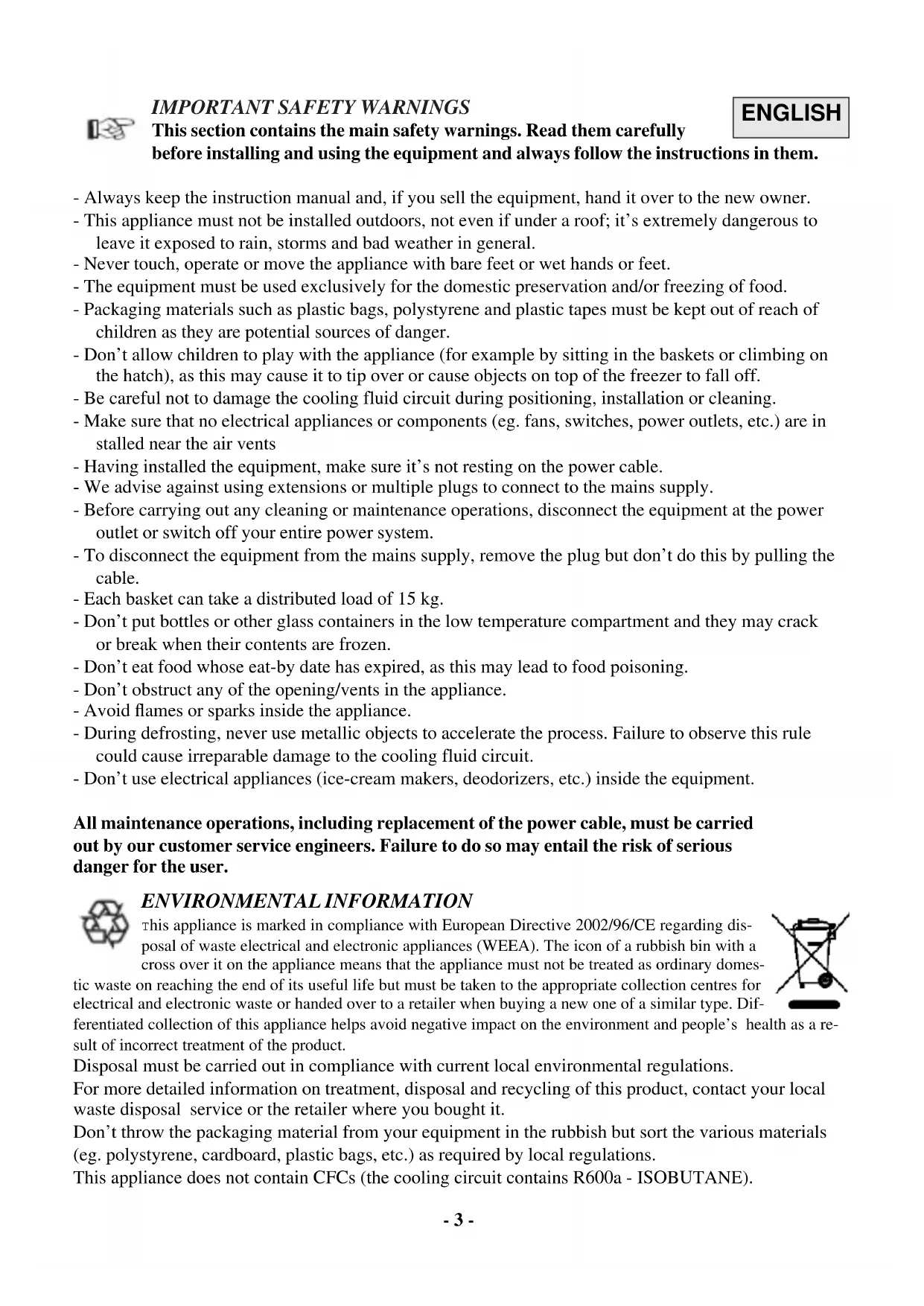 This section contains the main safety warnings. Read them carefully before installing and using the equipment and always follow the instructions in them. - Always keep the instruction manual and, if you sell the equipment, hand it over to the new owner. - This appliance must not be installed outdoors, not even if under a roof; it’s extremely dangerous to leave it exposed to rain, storms and bad weather in general. - Never touch, operate or move the appliance with bare feet or wet hands or feet. - The equipment must be used exclusively for the domestic preservation and/or freezing of food. - Packaging materials such as plastic bags, polystyrene and plastic tapes must be kept out of reach of children as they are potential sources of danger. - Don’t allow children to play with the appliance (for example by sitting in the baskets or climbing on the hatch), as this may cause it to tip over or cause objects on top of the freezer to fall off. - Be careful not to damage the cooling fluid circuit during positioning, installation or cleaning. - Make sure that no electrical appliances or components (eg. fans, switches, power outlets, etc.) are in stalled near the air vents - Having installed the equipment, make sure it’s not resting on the power cable. - We advise against using extensions or multiple plugs to connect to the mains supply. - Before carrying out any cleaning or maintenance operations, disconnect the equipment at the power outlet or switch off your entire power system. - To disconnect the equipment from the mains supply, remove the plug but don’t do this by pulling the cable. - Each basket can take a distributed load of 15 kg. - Don’t put bottles or other glass containers in the low temperature compartment and they may crack or break when their contents are frozen. - Don’t eat food whose eat-by date has expired, as this may lead to food poisoning. - Don’t obstruct any of the opening/vents in the appliance. - Avoid flames or sparks inside the appliance. - During defrosting, never use metallic objects to accelerate the process. Failure to observe this rule could cause irreparable damage to the cooling fluid circuit. - Don’t use electrical appliances (ice-cream makers, deodorizers, etc.) inside the equipment. All maintenance operations, including replacement of the power cable, must be carried out by our customer service engineers. Failure to do so may entail the risk of serious danger for the user. ENGLISH