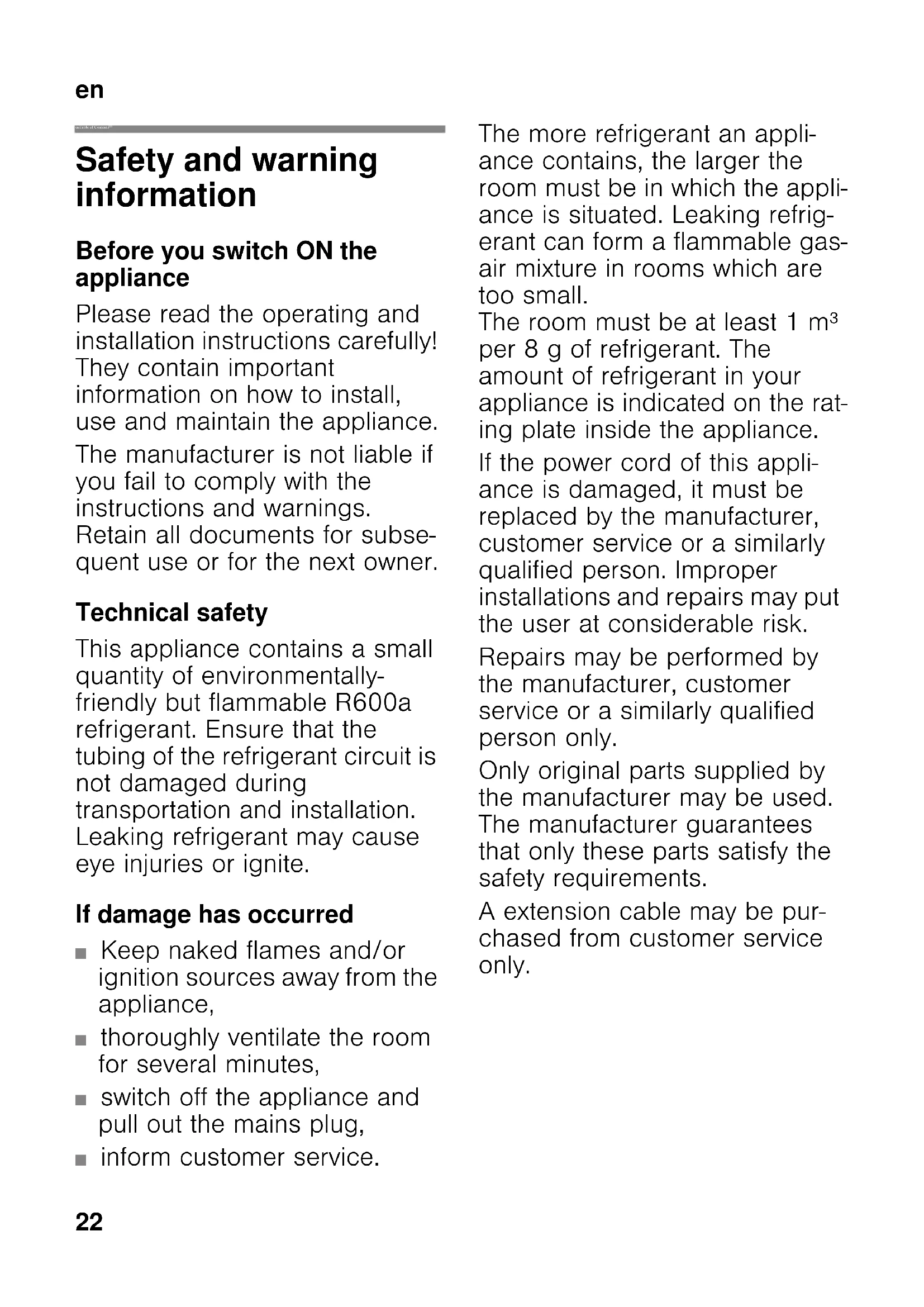 enTable of Contents enInstruction for Use Safety and warning information Before you switch ON the appliance Please read the operating and installation instructions carefully! They contain important information on how to install, use and maintain the appliance. The manufacturer is not liable if you fail to comply with the instructions and warnings. Retain all documents for subse- quent use or for the next owner. Technical safety This appliance contains a small quantity of environmentally- friendly but flammable R600a refrigerant. Ensure that the tubing of the refrigerant circuit is not damaged during transportation and installation. Leaking refrigerant may cause eye injuries or ignite. If damage has occurred ■ Keep naked flames and/or ignition sources away from the appliance, ■ thoroughly ventilate the room for several minutes, ■ switch off the appliance and pull out the mains plug, ■ inform customer service. The more refrigerant an appli- ance contains, the larger the room must be in which the appli- ance is situated. Leaking refrig- erant can form a flammable gas- air mixture in rooms which are too small. The room must be at least 1 m³ per 8 g of refrigerant. The amount of refrigerant in your appliance is indicated on the rat- ing plate inside the appliance. If the power cord of this appli- ance is damaged, it must be replaced by the manufacturer, customer service or a similarly qualified person. Improper installations and repairs may put the user at considerable risk. Repairs may be performed by the manufacturer, customer service or a similarly qualified person only. Only original parts supplied by the manufacturer may be used. The manufacturer guarantees that only these parts satisfy the safety requirements. A extension cable may be pur- chased from customer service only.en