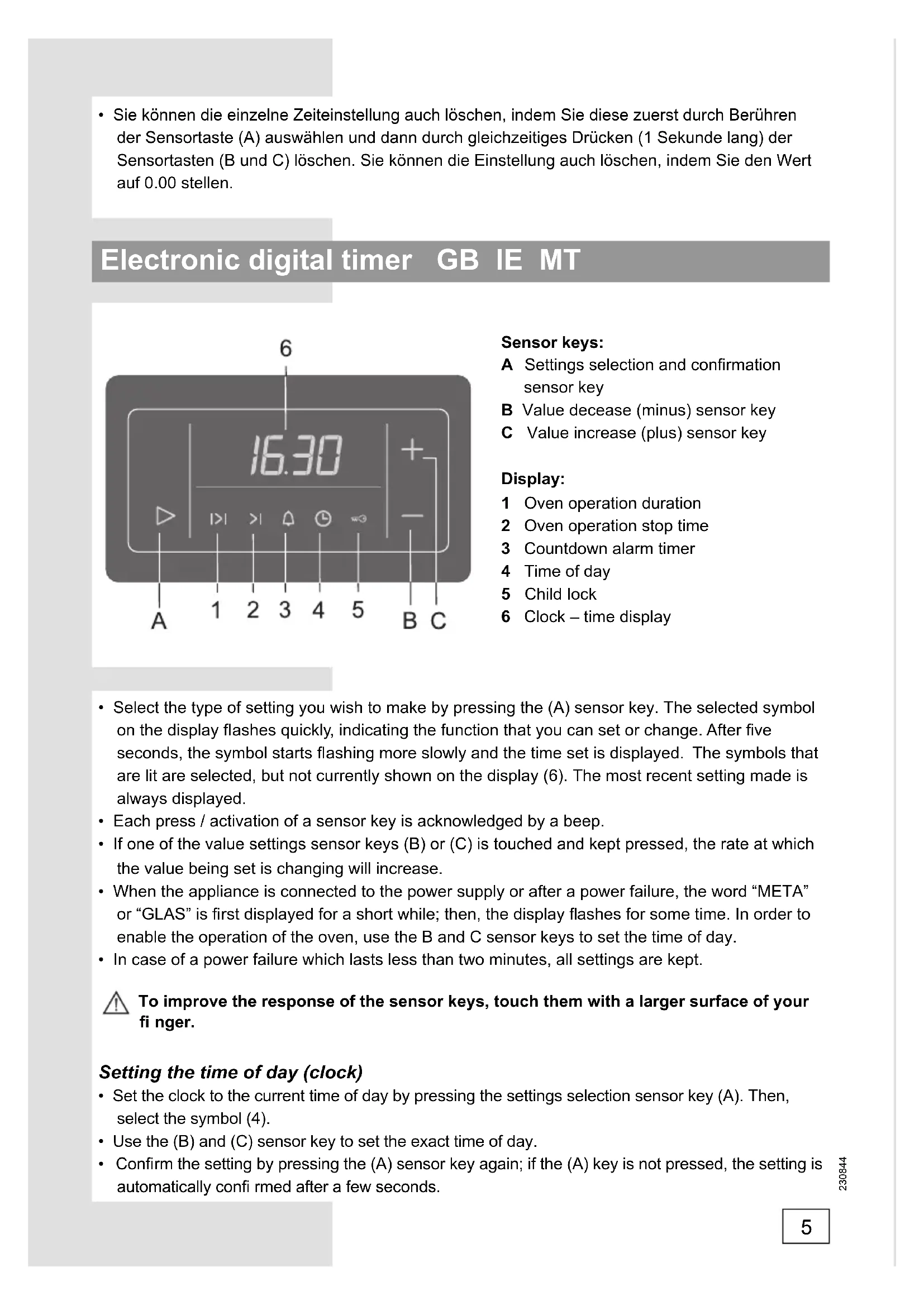 - In case of a power failure which lasts less than two minutes, all settings are kept. To improve the response of the sensor keys, touch them with a larger surface of your fi nger. Setting the time of day (clock)
