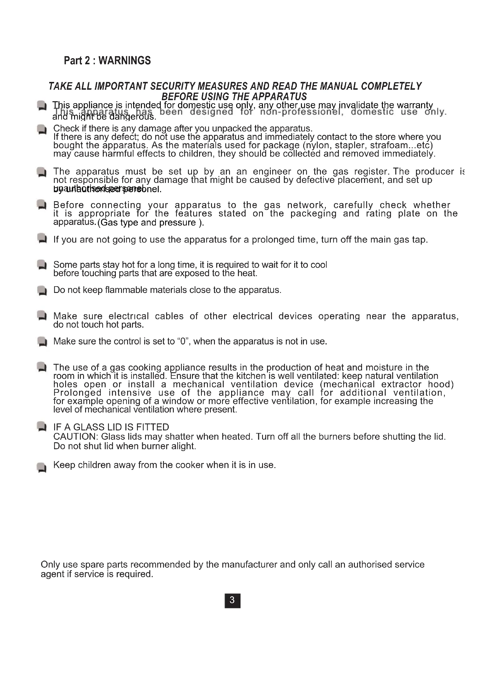 CAUTION: Glass lids may shatter when heated. Turn off all the burners before shutting the lid. Do not shut lid when burner alight. Keep children away from the cooker when it is in use. Only use spare parts recommended by the manufacturer and only call an authorised service agent if service is required. This appliance is intended for domestic use only, any other use may invalidate the warranty and might be dangerous. (Gas type and pressure ). by unauthorised personel.Part 3 : INSTALLATION AND PREPARATION FOR USE Read this manual before you use the apparatus for the first time, make sure that the installation is carried out to local laws by an installation engineer registered on the gas safe register.Failure to do this will render the guarantee VOID.