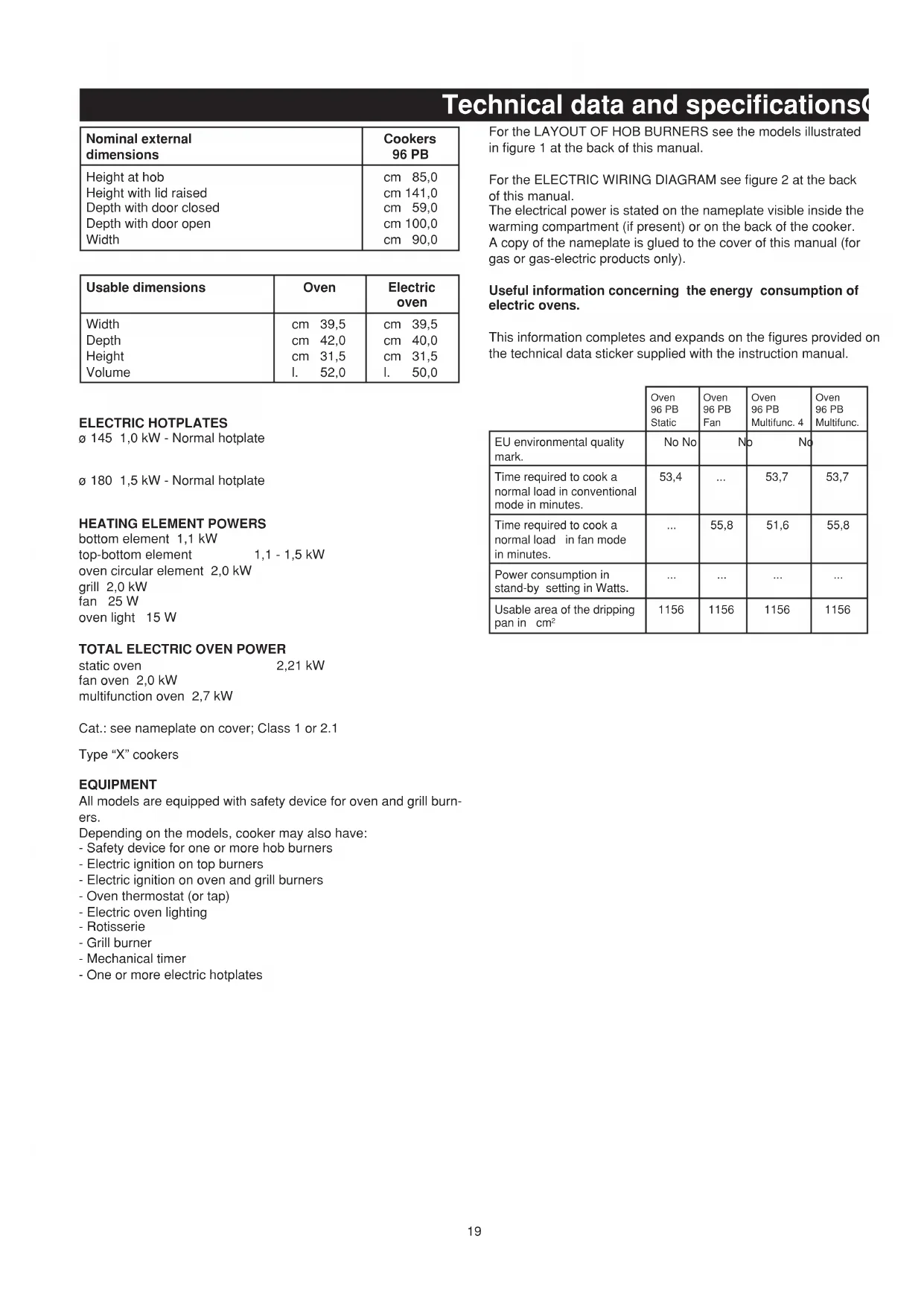 Nominal external dimensions Cookers 96 PB Height at hob Height with lid raised Depth with door closed Depth with door open Width cm 85,0 cm 141,0 cm 59,0 cm 100,0 cm 90,0 Usable dimensions Oven Electric oven Width Depth Height Volume cm 39,5 cm 42,0 cm 31,5 l. 52,0 cm 39,5 cm 40,0 cm 31,5 l. 50,020 INSTALLATION The appliance must be installed by qualified staff working in accord- ance with the regulations in force.Before installing, ensure that the appliance is correctly preset for the local distribution conditions (gas type and pressure).The presettings of this appliance are indicated on the nameplate shown on the cover.This appliance is not connected to a flue gas extractor device. It must be installed and connected in accordance with the regulations in force.This appliance may only be installed and may only operate in rooms permanently ventilated in accordance with national regulations in force. VENTILATION The rooms in which gas appliances are installed must be well ven- tilated in order to allow correct gas combustion and ventilation. The air flow necessary for combustion is at least 2 m