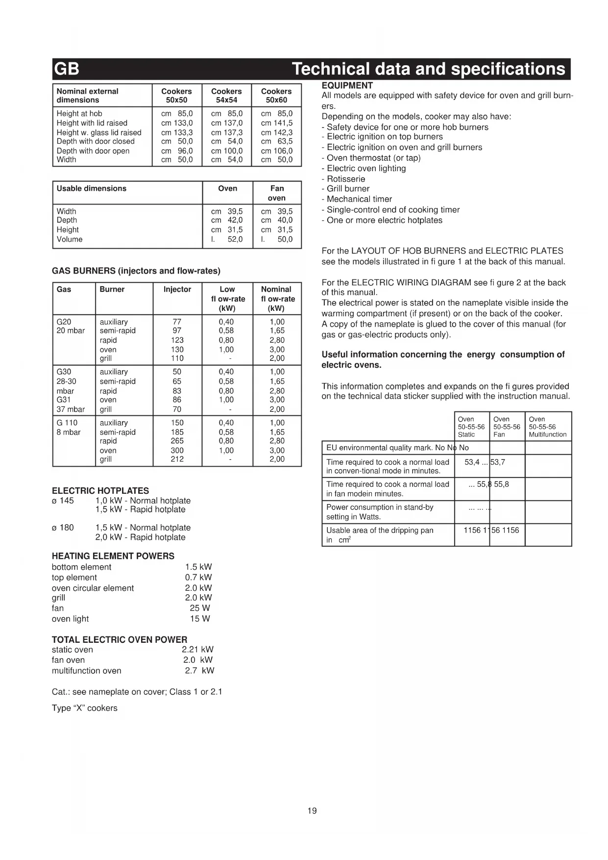 - The oven shelf is designed to take normal oven dishes for cooking sweets or roasts, or is used without a pan for cooking foods under the grill. - The drip pan under the grill is used to collect juices, which drip from the food that is cooked directly on the grill. The drip pan can also be used for cooking - Remember that cooking times may vary if food is cooked on two shelves at the same time. GENERAL PRECAUTIONS - This appliance must not be used by those with reduced mental or motor capacities (including children), or by those who are not ex- perienced or know how to work it, unless supervised or instructed on its use by safety personnel. Children must be supervised to ensure that they do not play with the appliance. - Always disconnect the power supply before any work inside the oven or where live parts may be accessed. - Never use the warming compartment for storing infl ammable liq- uids or items which do not withstand heat, such as wood, paper, aerosol cans, matches, etc. - Make frequent checks on the rubber connection hose, ensuring that it is well away from hot surfaces, that there are no sharp bends or kinks, and that it is in good condition. The hose must be replaced at the latest at the indicated date and must be secured at both ends using a standard hose clamp. - If taps become stiff to operate over time, contact the After-Sales service. - Wash enamelled or chrome-plated parts with soapy lukewarm water or non-abrasive detergents. A metal brush may be used to remove deposits from hob burners and fl ame caps. Dry thoroughly. - Never use abrasives to clean enamelled or chrome-plated parts. - Do not use too much water when washing the hob. Take care that no water or other substances enter the burner housing holes, as this may be dangerous. - The spark plugs for electric ignition must be kept clean and dry; always check after use, particularly if there have been drips or overfl ows from pans. - Never close glass lids until the hob burners or hotplates have cooled completely; it might shatter or crack. - Never knock enamelled parts or ignition spark plugs (where present). - The main or wall gas tap should be turned off when the cooker is not in use. - Never move the cooker by means of the handle. - Do not clean the glass doors of the oven with rough, abrasive materials or sharp metal scrapers, since they may scratch the surface and cause the glass to shatter. - Do not use vapor jets to clean the appliance. - The cooker does not have an installation stand. CAUTION: The use of a gas cooking appliance results in the production of heat, moisture and products of combustion in the room in which it is installed. Ensure that the kitchen is well ventilated especially when the appliance is in use: keep natural ventilation holes open or install a mechanical ventilation device (mechanical extractor hood). CAUTION: This appliance is for cooking purposes only. It must not be used for other purposes, for example room heating. No liability is accepted for injury or damage caused by poor instal- lation or improper use of the cooker. In case of malfunctions, particularly gas leaks or short-circuits, contact your engineer without delay. For the user GB25