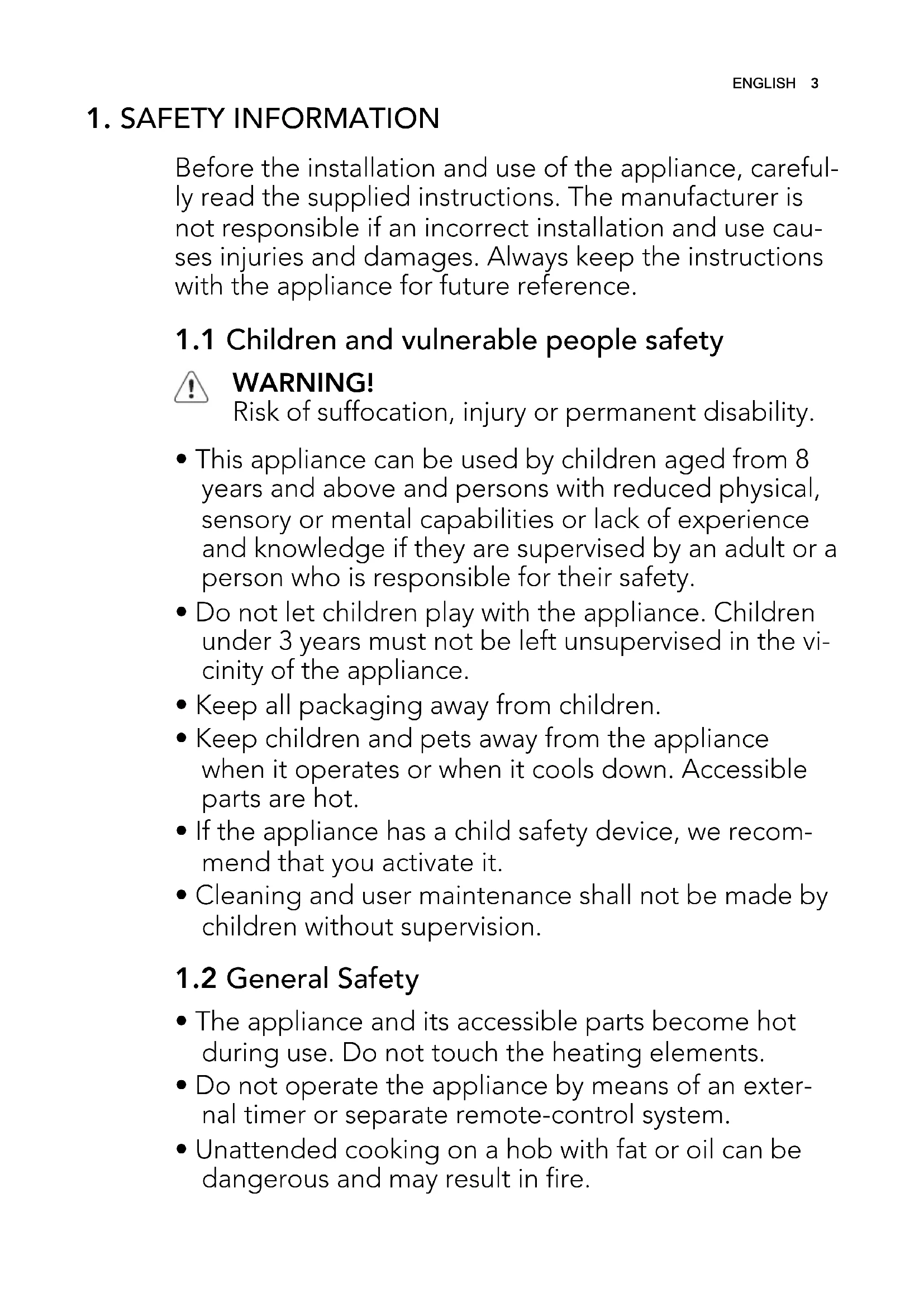 - Unattended cooking on a hob with fat or oil can be dangerous and may result in fire. ENGLISH 3• Never try to extinguish a fire with water, but switch off the appliance and then cover flame e.g. with a lid or a fire blanket.
