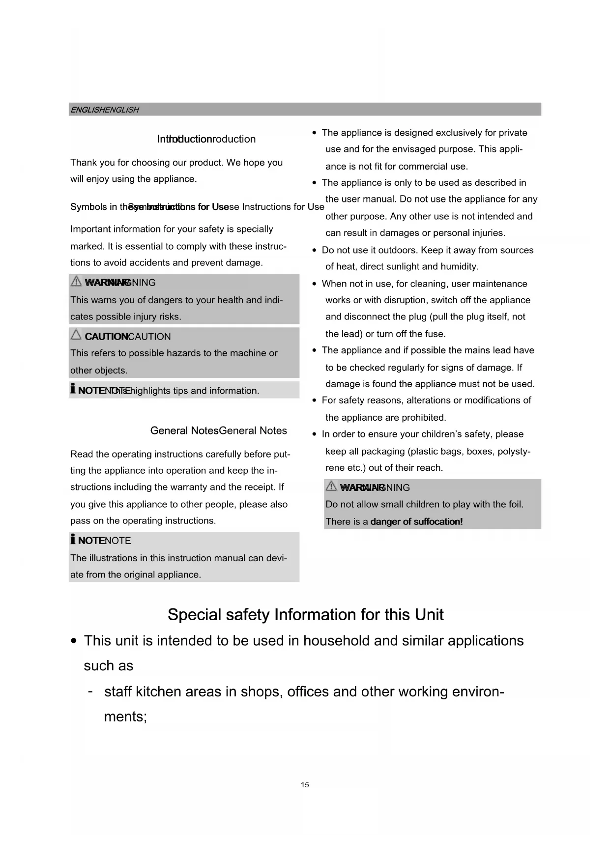 - This unit is intended to be used in household and similar applications such as - staff kitchen areas in shops, offices and other working environ- ments;16 - farm houses and by clients in hotels, motels and other residential type environments; - bed and breakfast type environments; - catering and similar non-retail applications.