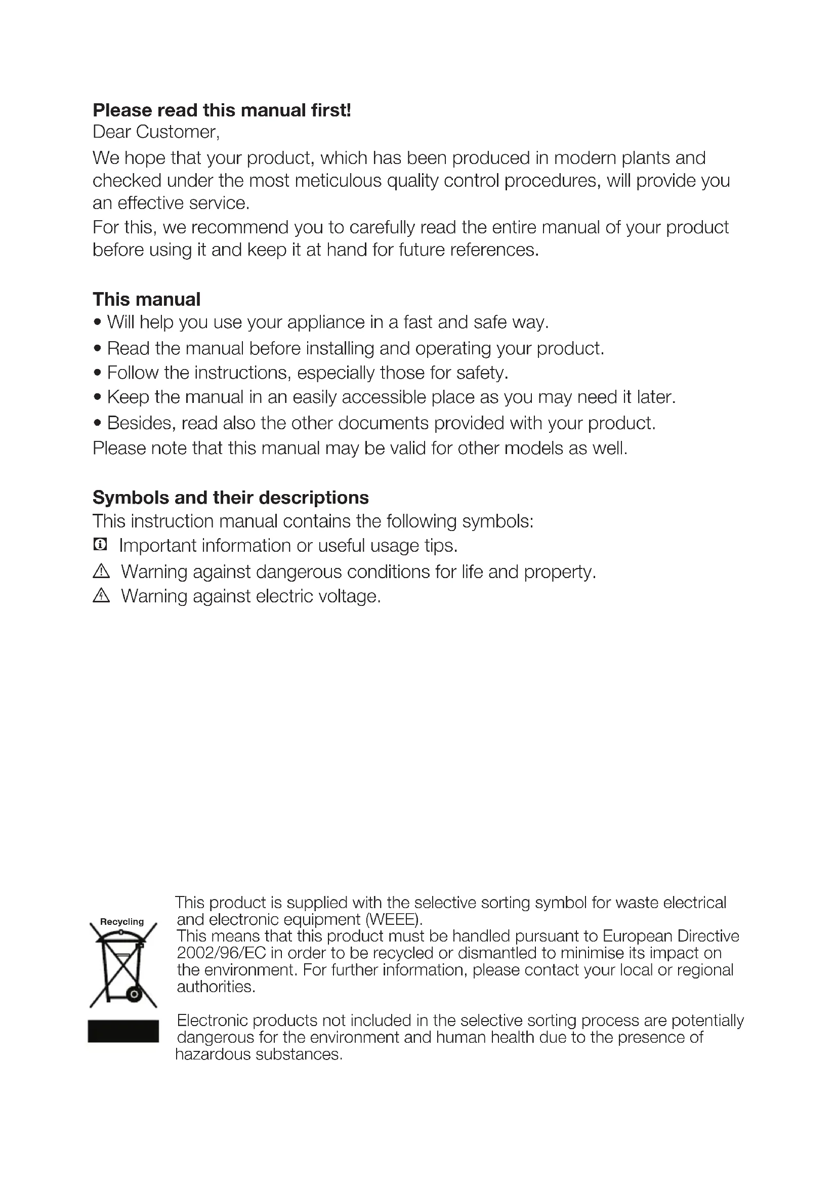 - Besides, read also the other documents provided with your product. Please note that this manual may be valid for other models as well. Symbols and their descriptions This instruction manual contains the following symbols: C Important information or useful usage tips. A Warning against dangerous conditions for life and property. B Warning against electric voltage. This product is supplied with the selective sorting symbol for waste electrical and electronic equipment (WEEE). This means that this product must be handled pursuant to European Directive 2002/96/EC in order to be recycled or dismantled to minimise its impact on the environment. For further information, please contact your local or regional authorities. Electronic products not included in the selective sorting process are potentially dangerous for the environment and human health due to the presence of hazardous substances. RecyclingEN