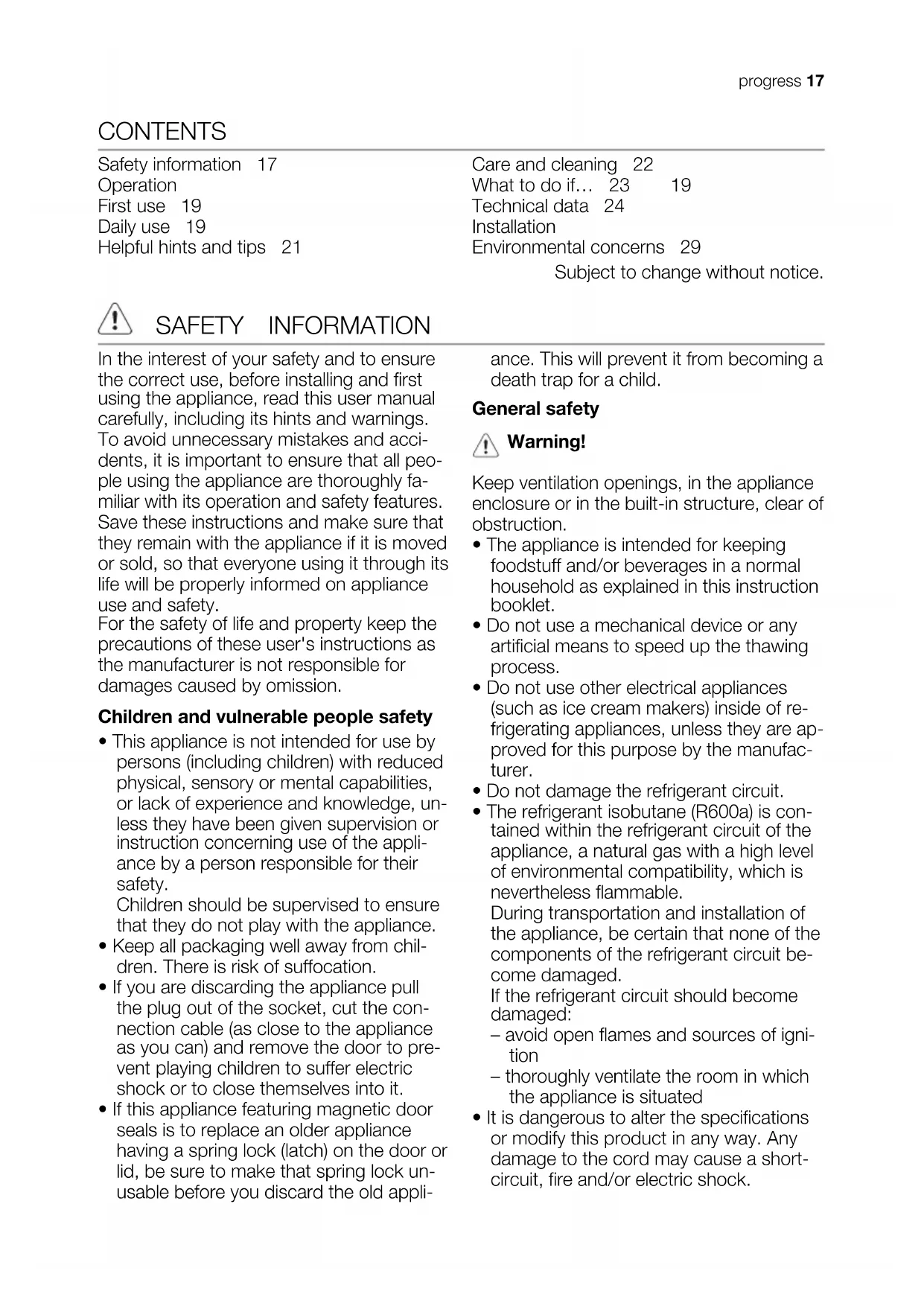 - do not exceed the storage period indica- ted by the food manufacturer. progress 21CARE AND CLEANING Caution! Unplug the appliance before carrying out any maintenance operation. This appliance contains hydrocarbons in its cooling unit; maintenance and re- charging must therefore only be carried out by authorized technicians. Periodic cleaning The equipment has to be cleaned regularly: