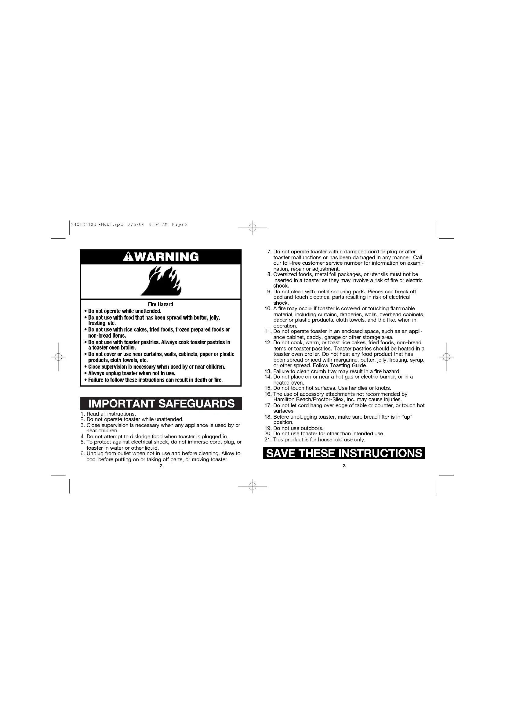 Pop Tart is a registered trademark of the Kellogg Co. 840124100 ENv01.qxd 2/6/04 9:54 AM Page 47 LIMITED WARRANTY This product is warranted to be free from defects in material and workmanship for a period of two (2) years for Hamilton Beach Portfolio products, one (1) year for Hamilton Beach products or one hundred eighty (180) days for Proctor-Silex products from the date of original purchase, except as noted below. During this period, we will repair or replace this product, at our option, at no cost. THE FOREGOING WARRANTY IS IN LIEU OF ANY OTHER WARRANTY, WHETHER EXPRESS OR IMPLIED, WRITTEN OR ORAL INCLUDING ANY WARRANTY OF MERCHANTABILITY OR FITNESS FOR A PARTICULAR PURPOSE. ANY LIABILITY IS EXPRESSLY LIMITED TO AN AMOUNT EQUAL TO THE PURCHASE PRICE PAID, AND ALL CLAIMS FOR SPECIAL, INCIDENTAL AND CONSEQUENTIAL DAMAGES ARE HEREBY EXCLUDED. There is no warranty with respect to the following, which may be supplied with this product: glass parts, glass containers, cutter/strainer, blades, and/or agitators. This warranty extends only to the original consumer purchaser and does not cover a defect resulting from abuse, misuse, neglect, use for commercial purposes, or any use not in conformity with the printed directions. This warranty gives you specific legal rights, and you may also have other legal rights which vary from state to state, or province to province. Some states or provinces do not allow limitations on implied warranties or special, incidental or consequential damages, so the foregoing limitations may not apply to you. If you have a claim under this warranty, DO NOT RETURN THE APPLIANCE TO THE STORE! Please call our CUSTOMER SERVICE NUMBER. (For faster service please have model, series, and type numbers ready for operator to assist you.)