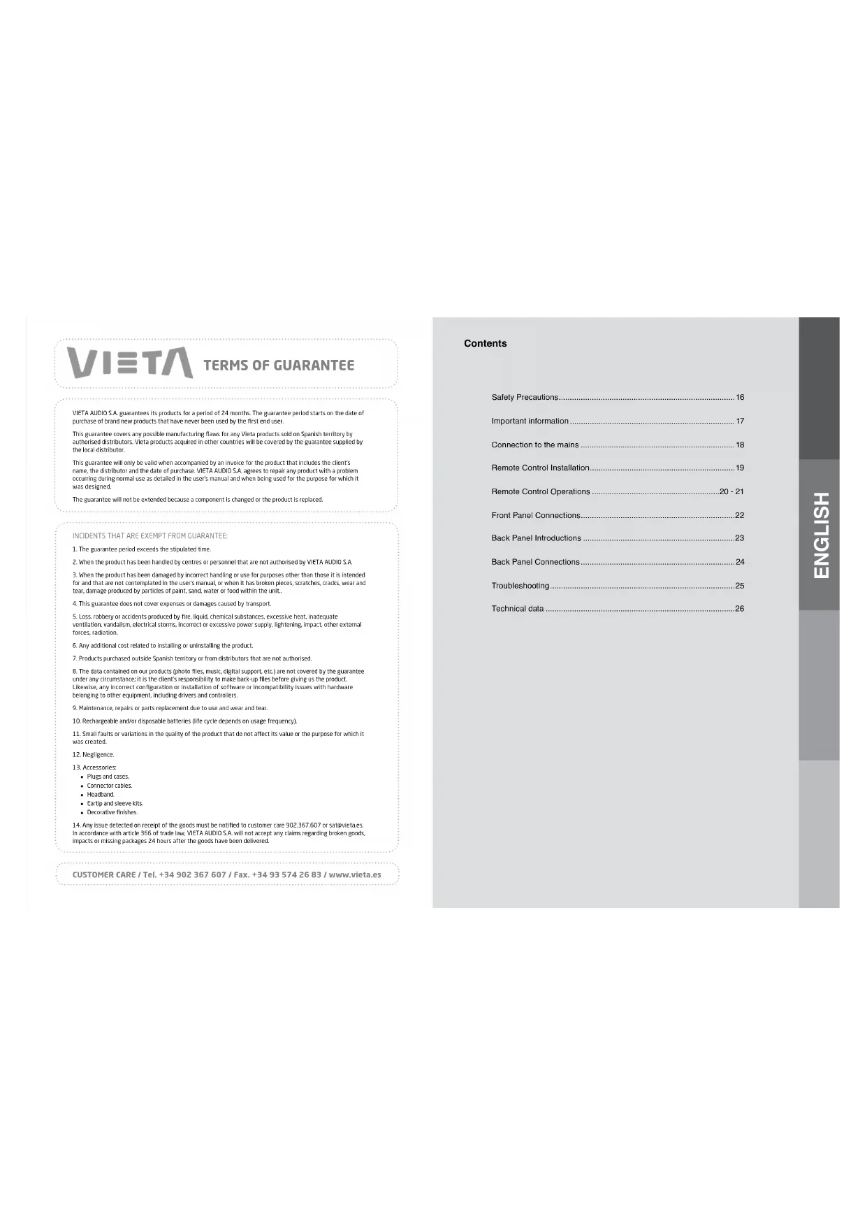 VIETA AUDIO S.A. guarantees its products for a period of 24 months. The guarantee period starts on the date of purchase of brand new products that have never been used by the first end user.