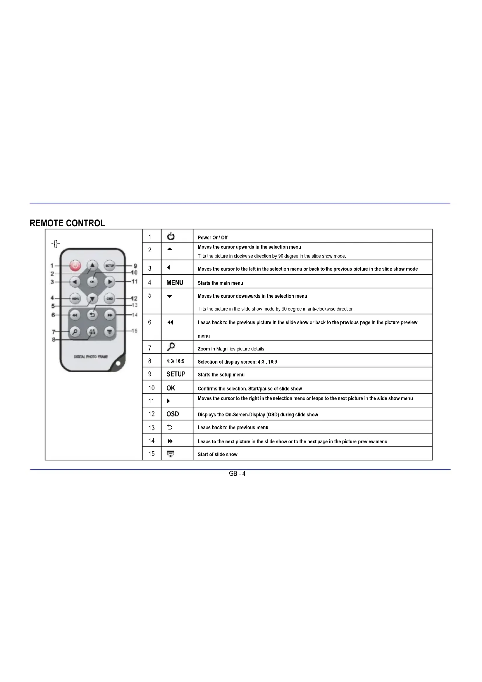 In each menu you can use the [ ] button on the remote control to start the slide show, starting with the first photo. To stop the slide show and to display individual photos please press the [ ] button on the DF or the OK-button on the remote control. By repeatedly pressing the [ ] button on the DF or the OK-button on the remote control you can proceed with the slide show.