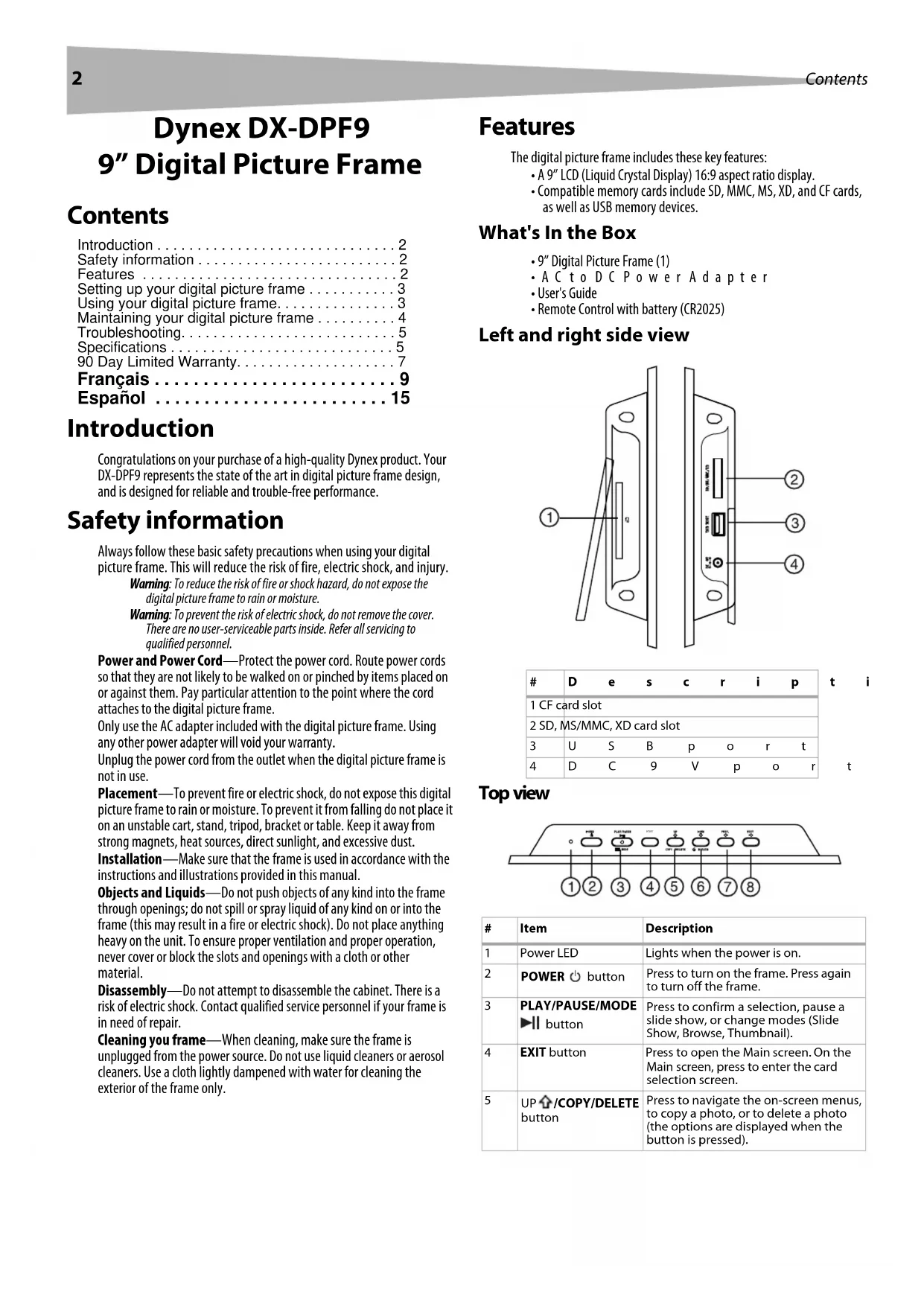 Congratulations on your purchase of a high-quality Dynex product. Your DX-DPF9 represents the state of the art in digital picture frame design, and is designed for reliable and trouble-free performance.