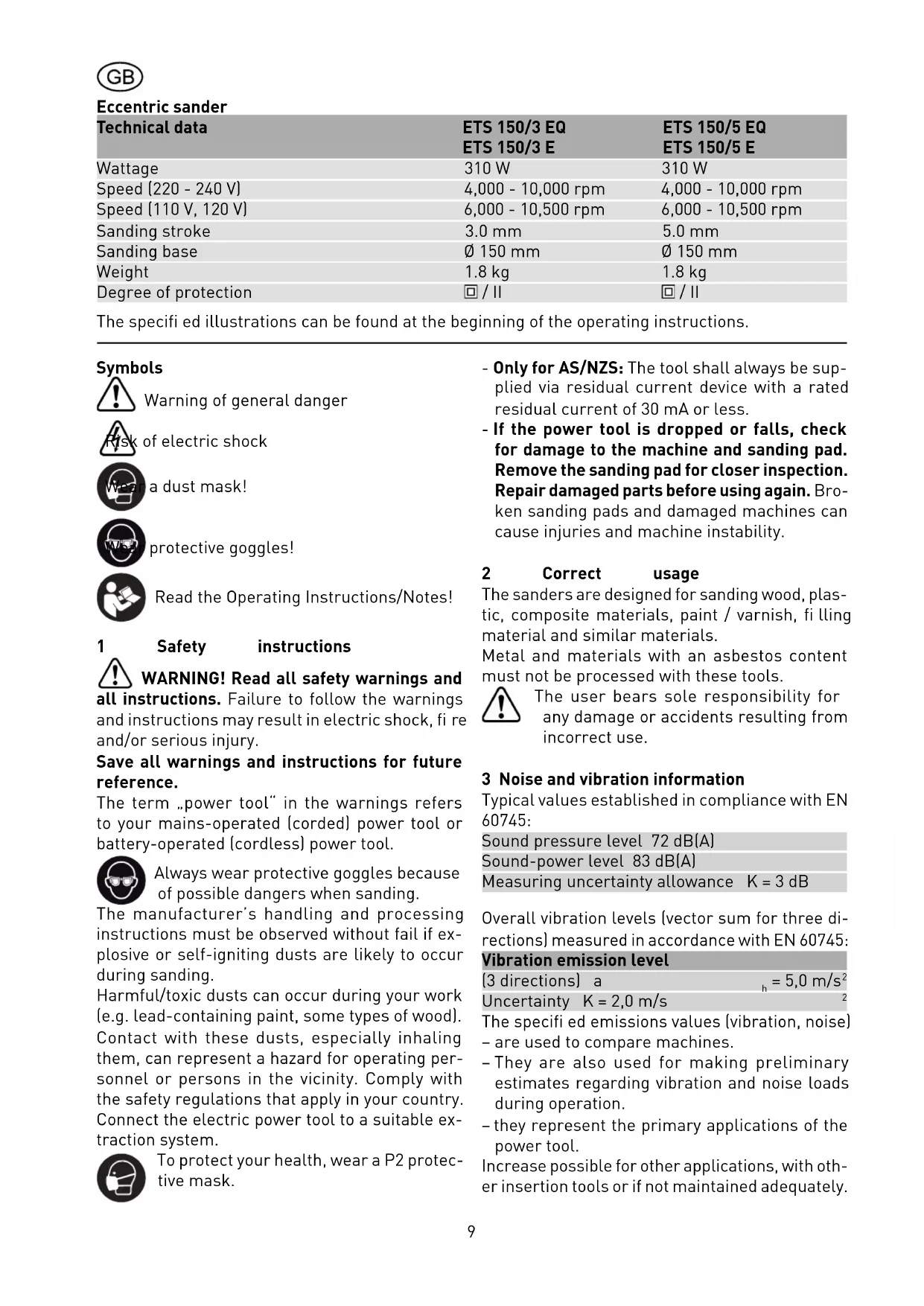 The specifi ed emissions values (vibration, noise) – are used to compare machines. – They are also used for making preliminary estimates regarding vibration and noise loads during operation. – they represent the primary applications of the power tool. Increase possible for other applications, with oth- er insertion tools or if not maintained adequately. Eccentric sander Technical data ETS 150/3 EQ ETS 150/5 EQ