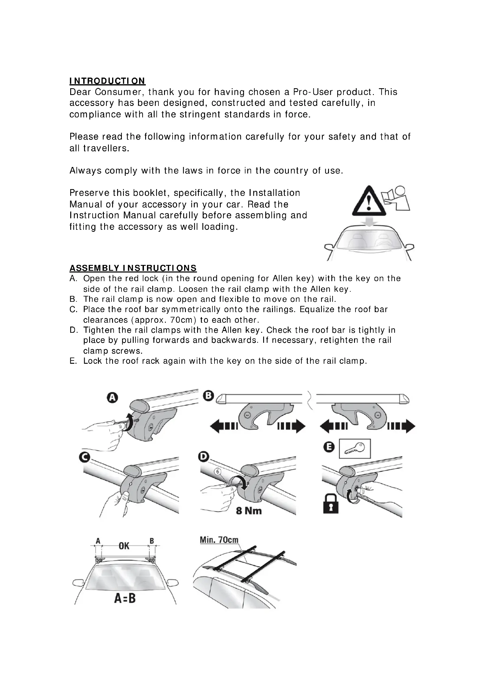 When assembling, ensure that the brackets do not protrude over the edge of the car roof. Also, ensure that the clearance between the two bars should be at least 70cm , unless otherwise specified by the manufacturer of your car.