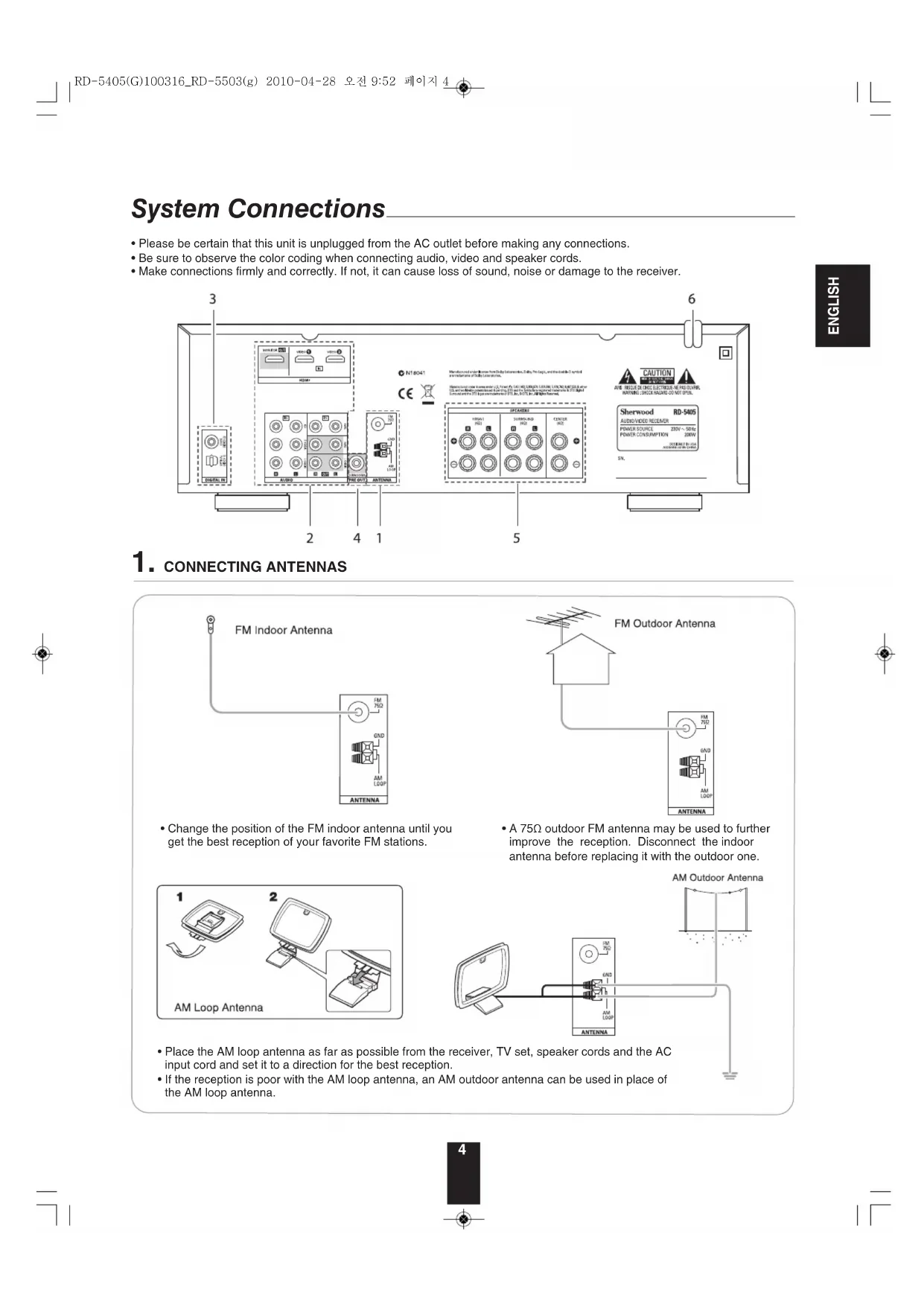 - A 75Ω outdoor FM antenna may be used to further improve the reception. Disconnect the indoor antenna before replacing it with the outdoor one. RD-5405(G)100316_RD-5503(g) 2010-04-28 오전 9:52 페이지 45 ENGLISH BD player, DVD player, tape deck, MD recorder, etc.