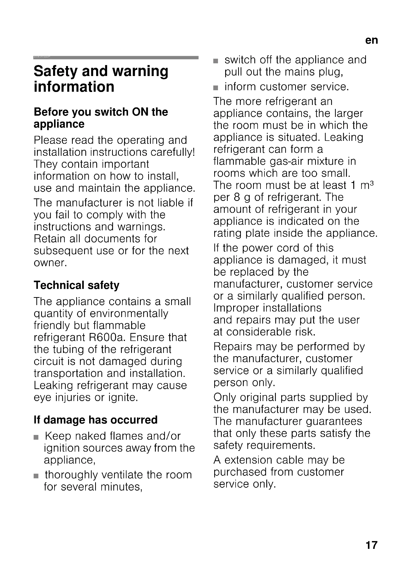 enTable of Contents enInstruction for Use Safety and warning information Before you switch ON the appliance Please read the operating and installation instructions carefully! They contain important information on how to install, use and maintain the appliance. The manufacturer is not liable if you fail to comply with the instructions and warnings. Retain all documents for subsequent use or for the next owner. Technical safety The appliance contains a small quantity of environmentally friendly but flammable refrigerant R600a. Ensure that the tubing of the refrigerant circuit is not damaged during transportation and installation. Leaking refrigerant may cause eye injuries or ignite. If damage has occurred ■ Keep naked flames and/or ignition sources away from the appliance, ■ thoroughly ventilate the room for several minutes, ■ switch off the appliance and pull out the mains plug, ■ inform customer service. The more refrigerant an appliance contains, the larger the room must be in which the appliance is situated. Leaking refrigerant can form a flammable gas-air mixture in rooms which are too small. The room must be at least 1 m³ per 8 g of refrigerant. The amount of refrigerant in your appliance is indicated on the rating plate inside the appliance. If the power cord of this appliance is damaged, it must be replaced by the manufacturer, customer service or a similarly qualified person. Improper installations and repairs may put the user at considerable risk. Repairs may be performed by the manufacturer, customer service or a similarly qualified person only. Only original parts supplied by the manufacturer may be used. The manufacturer guarantees that only these parts satisfy the safety requirements. A extension cable may be purchased from customer service only.en