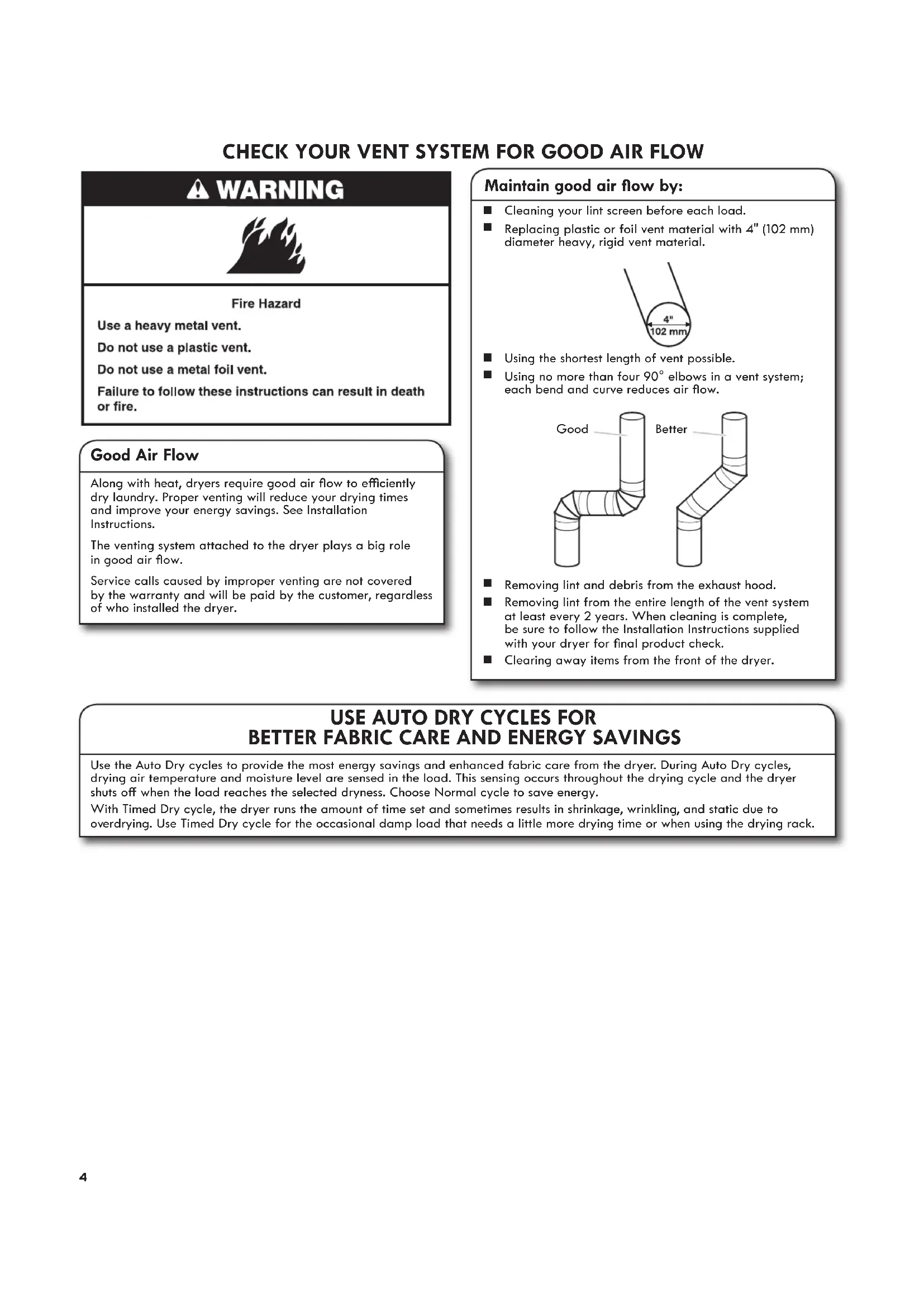 Clearing away items from the front of the dryer. Good Air Flow Along with heat, dryers require good air ow to eciently dry laundry. Proper venting will reduce your drying times and improve your energy savings. See Installation Instructions. The venting system attached to the dryer plays a big role in good air ow. Service calls caused by improper venting are not covered by the warranty and will be paid by the customer, regardless of who installed the dryer. Good Better5 Not all features and options are available on all models. Appearance may vary.
