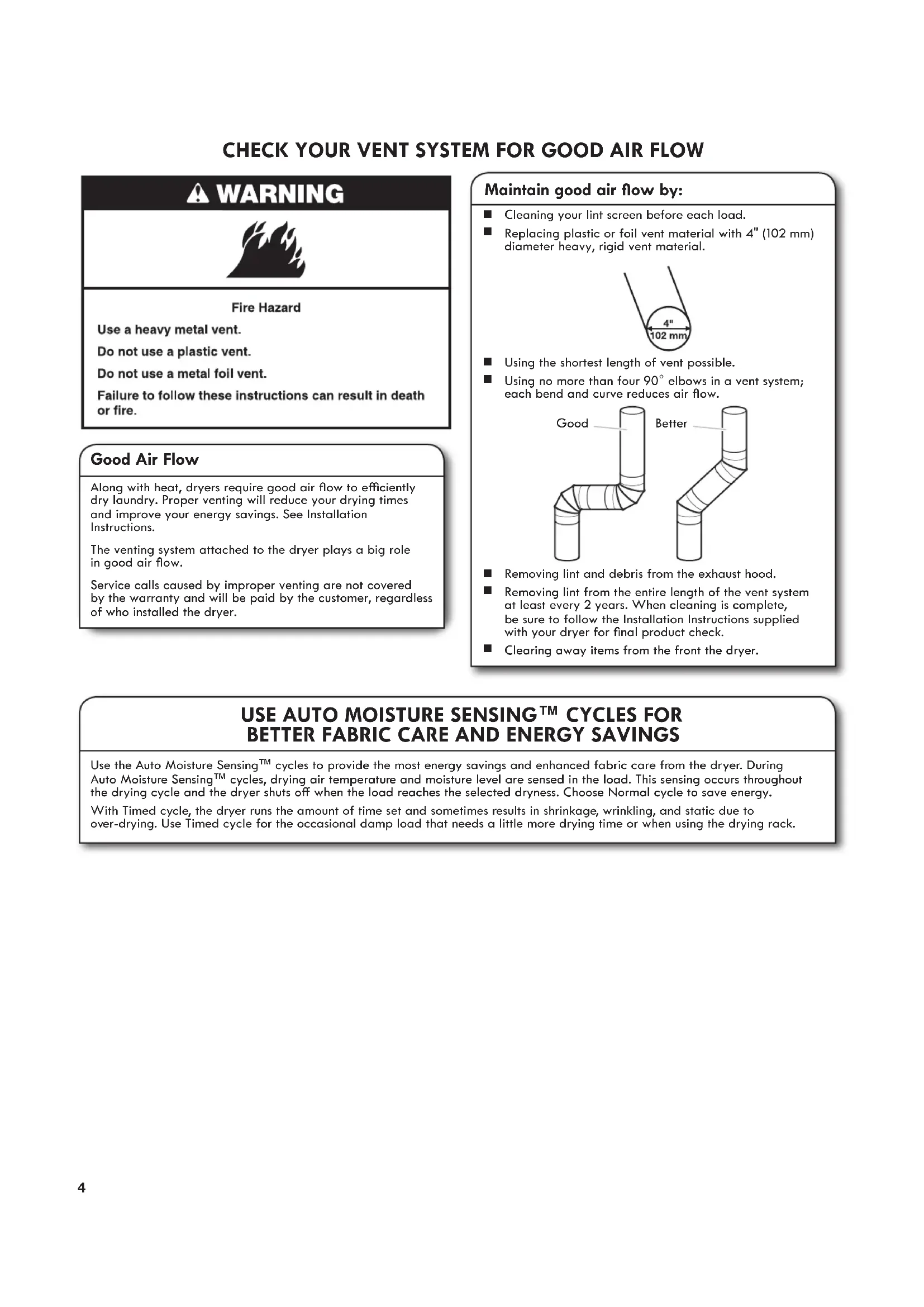 Clearing away items from the front the dryer. Good Air Flow Along with heat, dryers require good air ow to eciently dry laundry. Proper venting will reduce your drying times and improve your energy savings. See Installation Instructions. The venting system attached to the dryer plays a big role in good air ow. Service calls caused by improper venting are not covered by the warranty and will be paid by the customer, regardless of who installed the dryer. Good Better