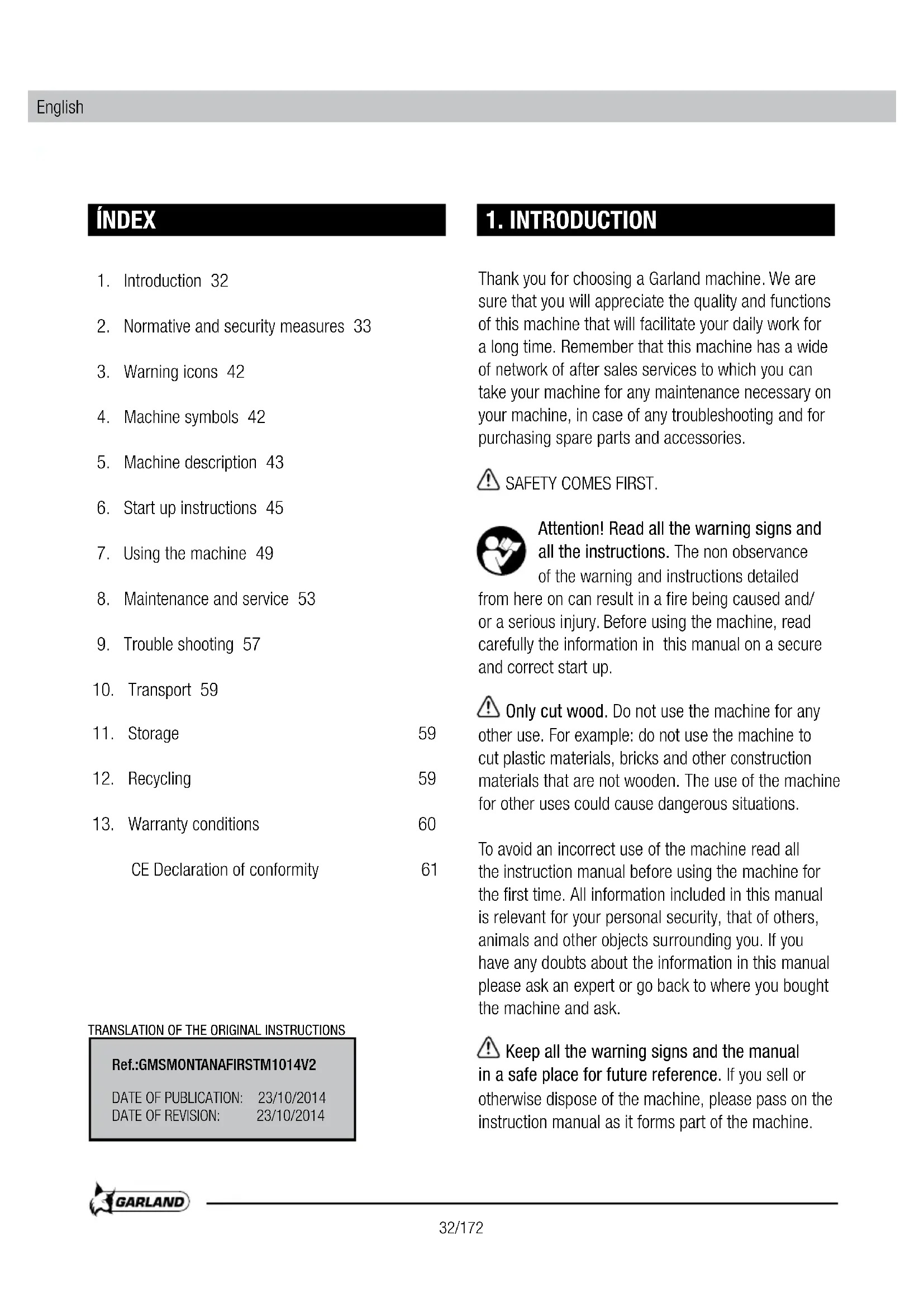 Thank you for choosing a Garland machine. We are sure that you will appreciate the quality and functions of this machine that will facilitate your daily work for a long time. Remember that this machine has a wide of network of after sales services to which you can take your machine for any maintenance necessary on your machine, in case of any troubleshooting and for purchasing spare parts and accessories.