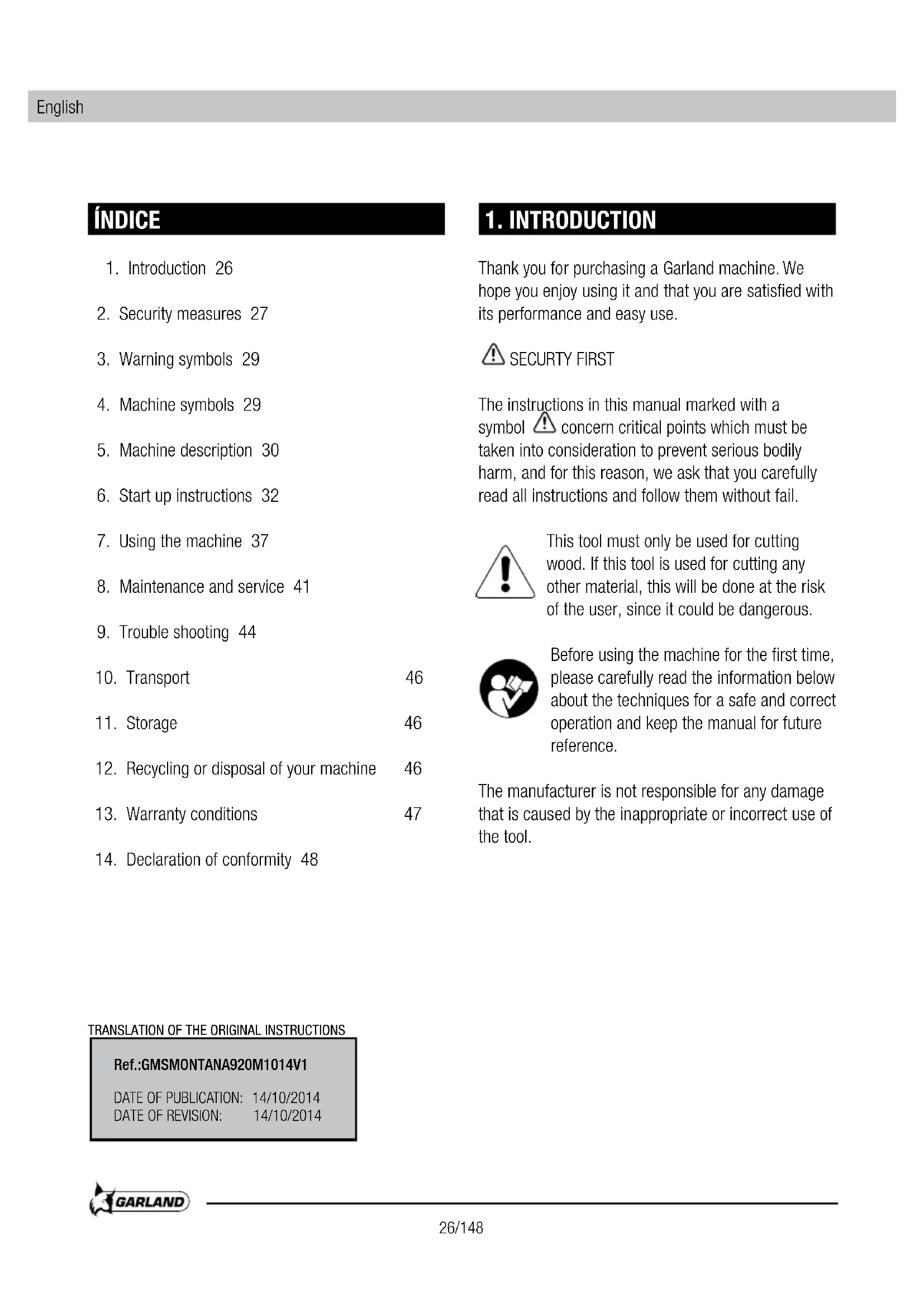 - Failures that turn out because of an incorrect use of the product, Garland will not be responsible if the replaced parts of the machine are not from Garland and if the machine has been modified in any way.