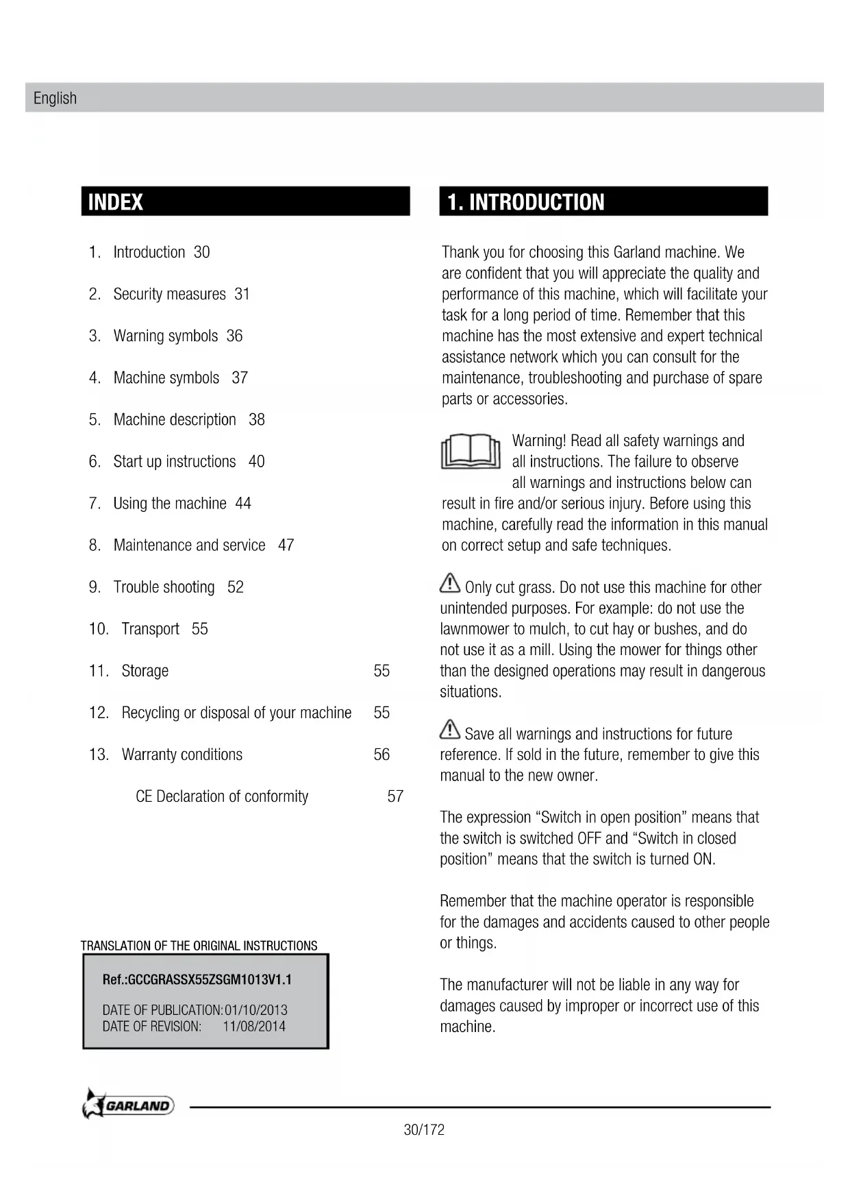 Thank you for choosing this Garland machine. We are confident that you will appreciate the quality and performance of this machine, which will facilitate your task for a long period of time. Remember that this machine has the most extensive and expert technical assistance network which you can consult for the maintenance, troubleshooting and purchase of spare parts or accessories.