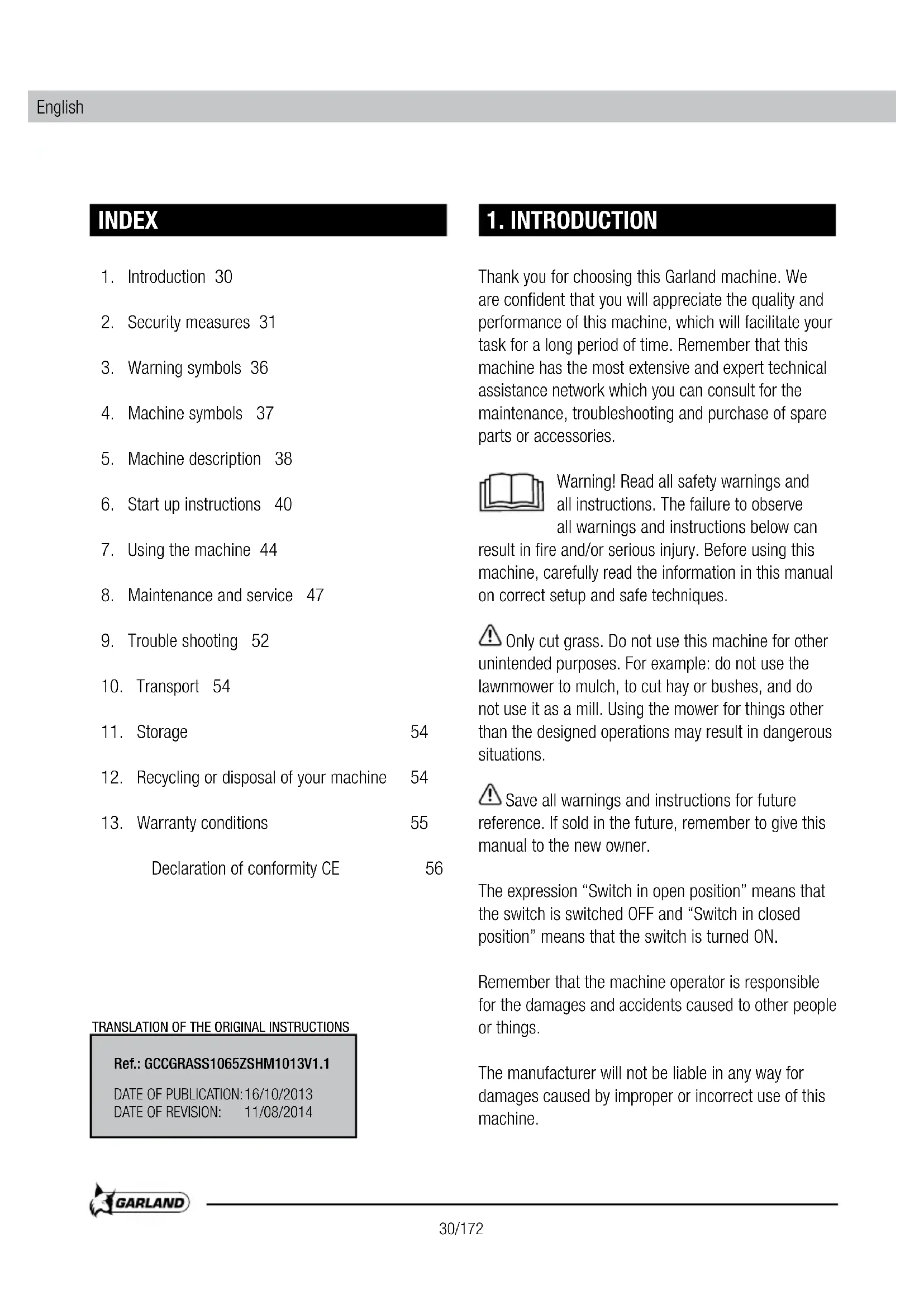Thank you for choosing this Garland machine. We are confident that you will appreciate the quality and performance of this machine, which will facilitate your task for a long period of time. Remember that this machine has the most extensive and expert technical assistance network which you can consult for the maintenance, troubleshooting and purchase of spare parts or accessories.