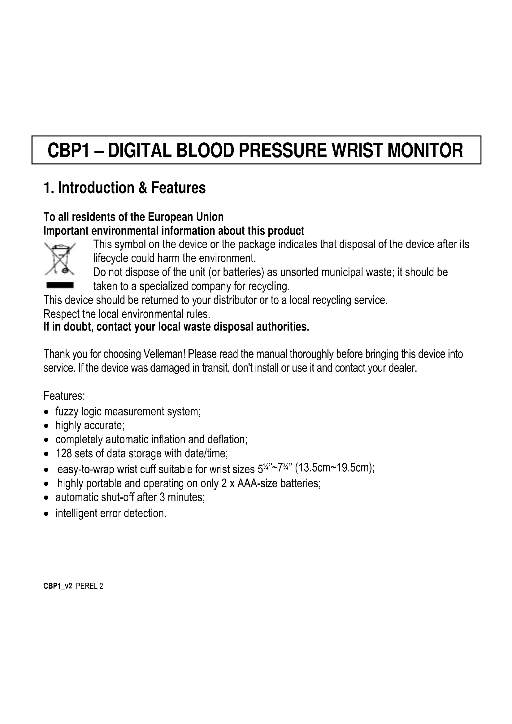 Download the instructions for your Blood pressure monitor in PDF format for free! Find your manual CBP1 - Perel and take your electronic device back in hand. On this page are published all the documents necessary for the use of your device. CBP1 by Perel.