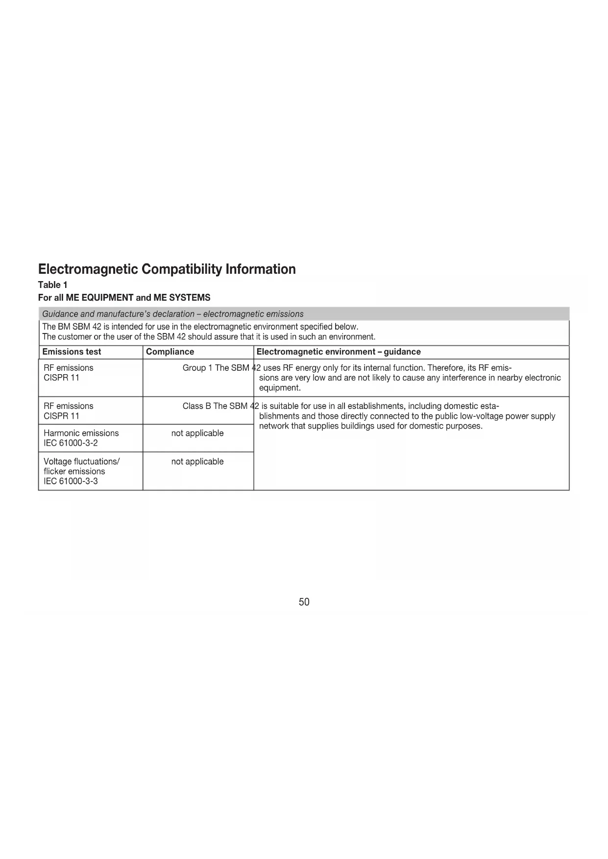 Tél. : 0 220 081 0350 Electromagnetic Compatibility Information Table 1 For all ME EQUIPMENT and ME SYSTEMS Guidance and manufacture’s declaration – electromagnetic emissions The BM SBM 42 is intended for use in the electromagnetic environment specified below. The customer or the user of the SBM 42 should assure that it is used in such an environment. Emissions test Compliance Electromagnetic environment – guidance RF emissions CISPR 11 Group 1 The SBM 42 uses RF energy only for its internal function. Therefore, its RF emis- sions are very low and are not likely to cause any interference in nearby electronic equipment. RF emissions CISPR 11 Class B The SBM 42 is suitable for use in all establishments, including domestic esta- blishments and those directly connected to the public low-voltage power supply network that supplies buildings used for domestic purposes. Harmonic emissions