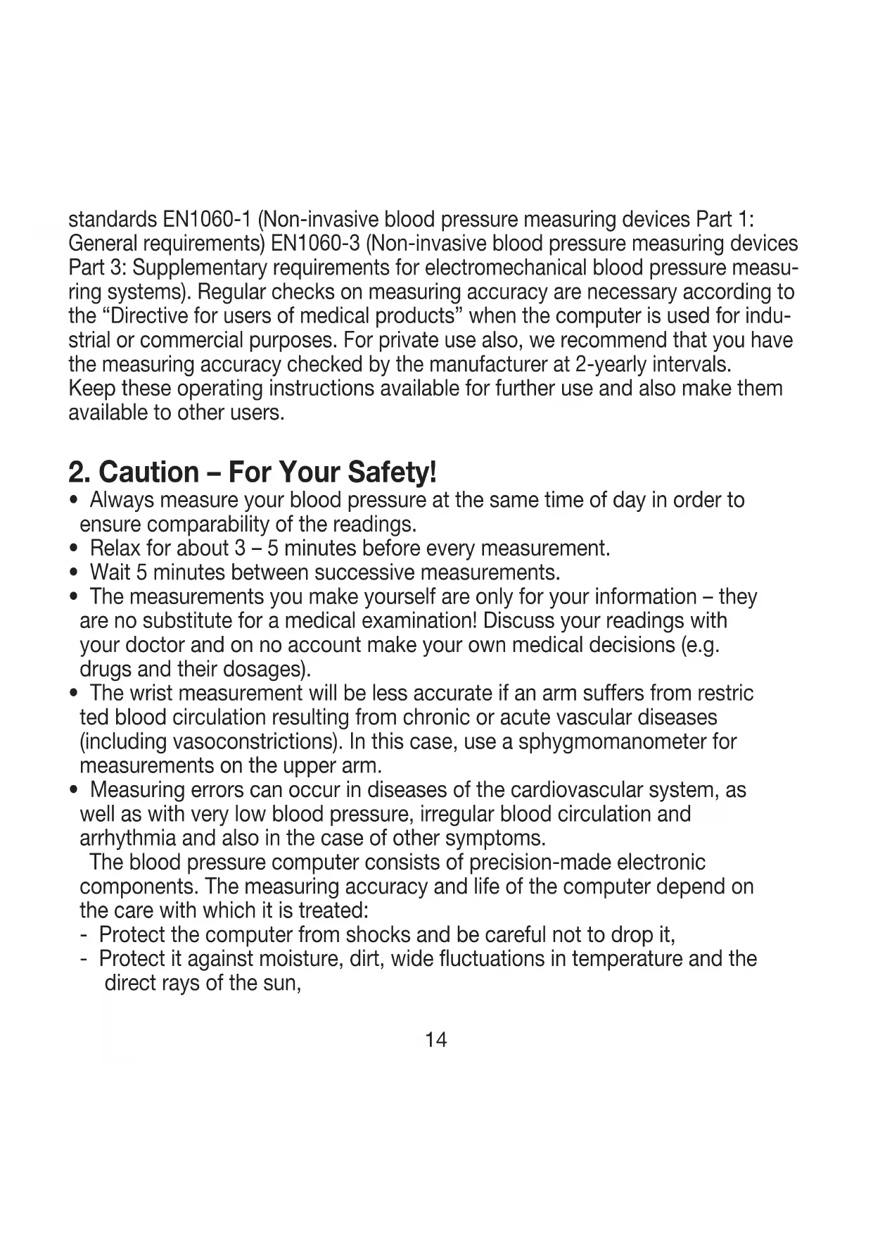 You can measure your blood pressure quickly and easily with the blood pressu- re wrist computer, save the readings – and display the progress and average of the readings. The wrist blood pressure monitor is used for non-invasive measu- rement and monitoring of adults´arterial blood pressure. The computer complies with the requirements of the European Directive for Medical Products, the German Medical Product Act as well as the European14 standards EN1060-1 (Non-invasive blood pressure measuring devices Part 1: General requirements) EN1060-3 (Non-invasive blood pressure measuring devices