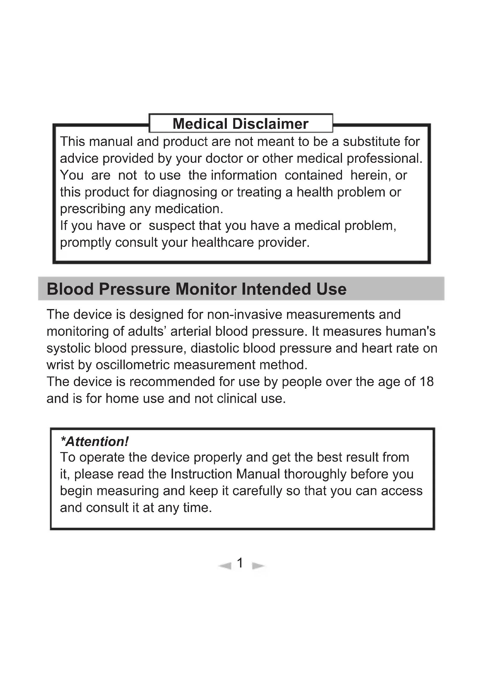 *Attention! To operate the device properly and get the best result from it, please read the Instruction Manual thoroughly before you begin measuring and keep it carefully so that you can access and consult it at any time. Medical Disclaimer1-1. What is blood pressure ?