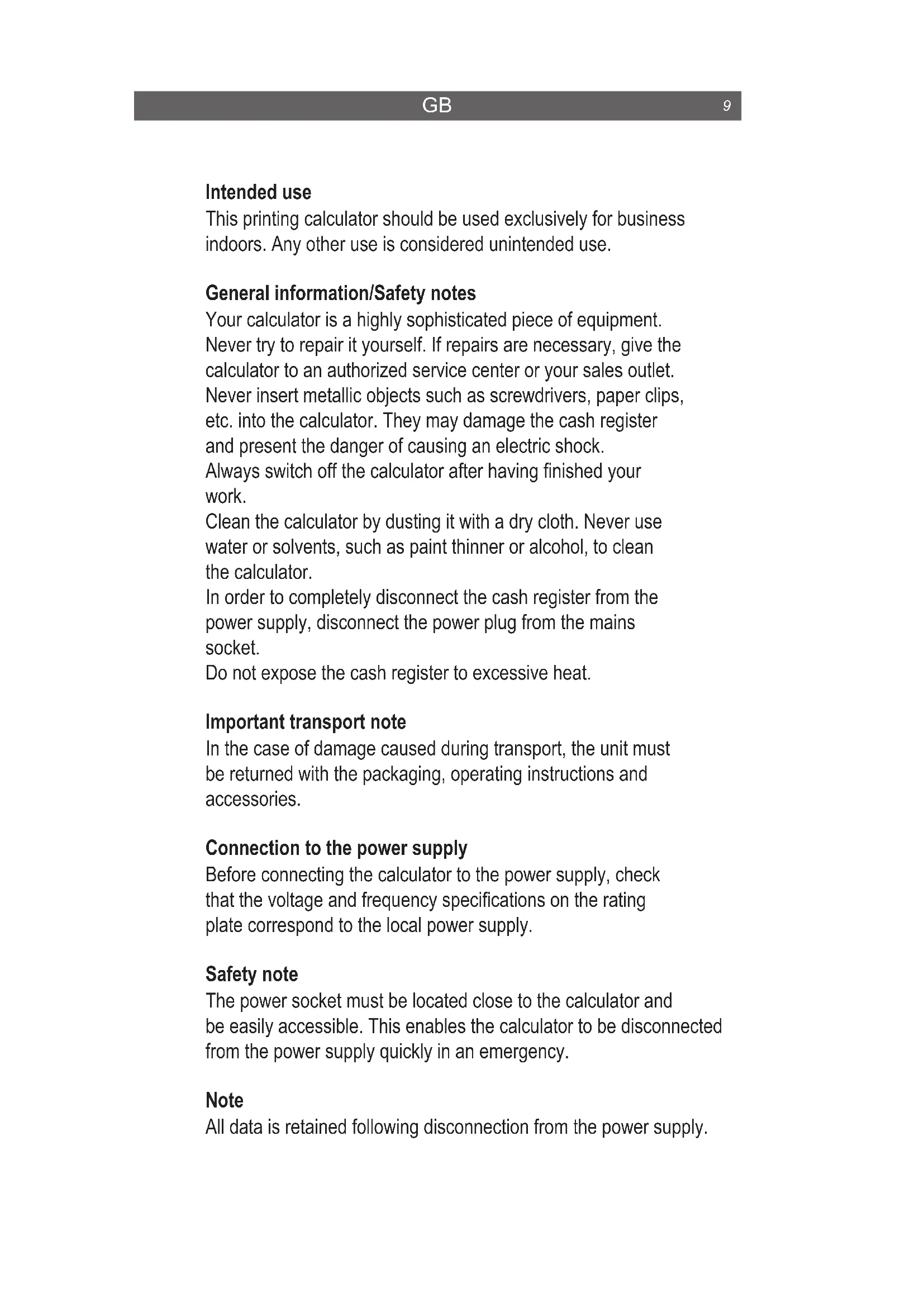 Intended use This printing calculator should be used exclusively for business indoors. Any other use is considered unintended use. General information/Safety notes Your calculator is a highly sophisticated piece of equipment. Never try to repair it yourself. If repairs are necessary, give the calculator to an authorized service center or your sales outlet. Never insert metallic objects such as screwdrivers, paper clips, etc. into the calculator. They may damage the cash register and present the danger of causing an electric shock. Always switch off the calculator after having finished your work. Clean the calculator by dusting it with a dry cloth. Never use water or solvents, such as paint thinner or alcohol, to clean the calculator. In order to completely disconnect the cash register from the power supply, disconnect the power plug from the mains socket. Do not expose the cash register to excessive heat. Important transport note In the case of damage caused during transport, the unit must be returned with the packaging, operating instructions and accessories. Connection to the power supply Before connecting the calculator to the power supply, check that the voltage and frequency specifications on the rating plate correspond to the local power supply. Safety note The power socket must be located close to the calculator and be easily accessible. This enables the calculator to be disconnected from the power supply quickly in an emergency. Note All data is retained following disconnection from the power supply.Disposal Do not dispose of electrical appliances as unsorted municipal waste, use separate collection facilities. Contact your local government for information regarding the collection systems available. If electrical appliances are disposed of in landfills or dumps, hazar- dous substances can leak into the groundwater and get into the food chain or poison the flora and fauna for years to come. When replacing old appliances with new ones, the retailer is legally obliged to take back your old appli- ance for disposal free of charge.