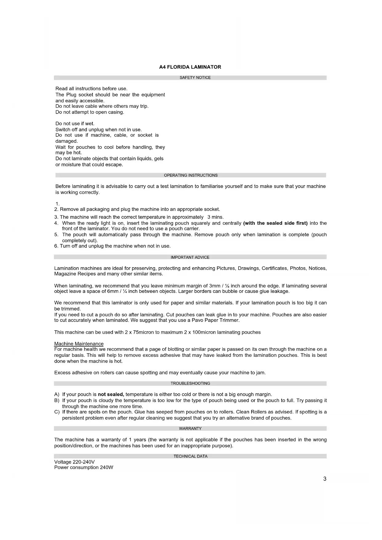Download the instructions for your Laminating machine in PDF format for free! Find your manual Florida A4 - Pavo and take your electronic device back in hand. On this page are published all the documents necessary for the use of your device. Florida A4 by Pavo.