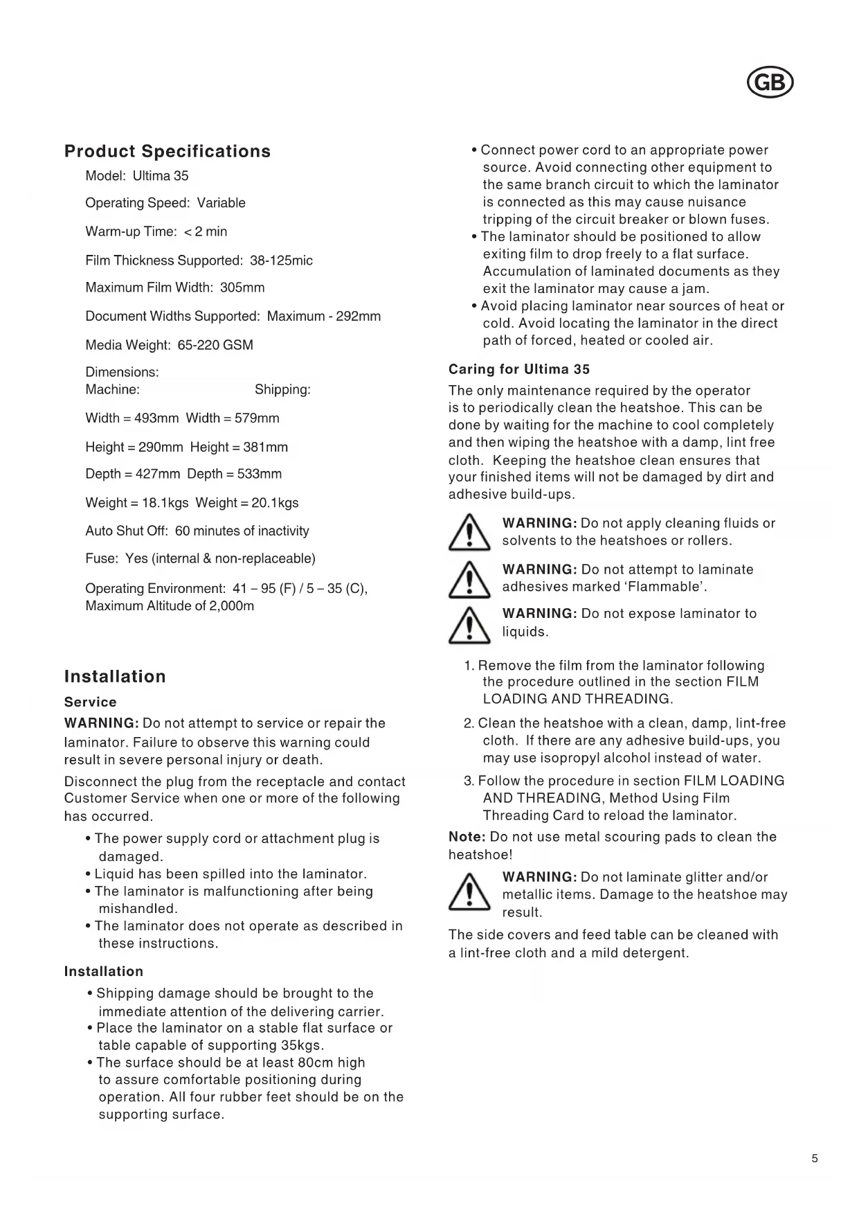 Product Specifications Model: Ultima 35 Operating Speed: Variable Warm-up Time: < 2 min Film Thickness Supported: 38-125mic Maximum Film Width: 305mm Document Widths Supported: Maximum - 292mm Media Weight: 65-220 GSM Dimensions: Machine: Shipping: Width = 493mm Width = 579mm Height = 290mm Height = 381mm Depth = 427mm Depth = 533mm Weight = 18.1kgs Weight = 20.1kgs Auto Shut O: 60 minutes of inactivity Fuse: Yes (internal & non-replaceable) Operating Environment: 41 – 95 (F) / 5 – 35 (C), Maximum Altitude of 2,000m Installation Service