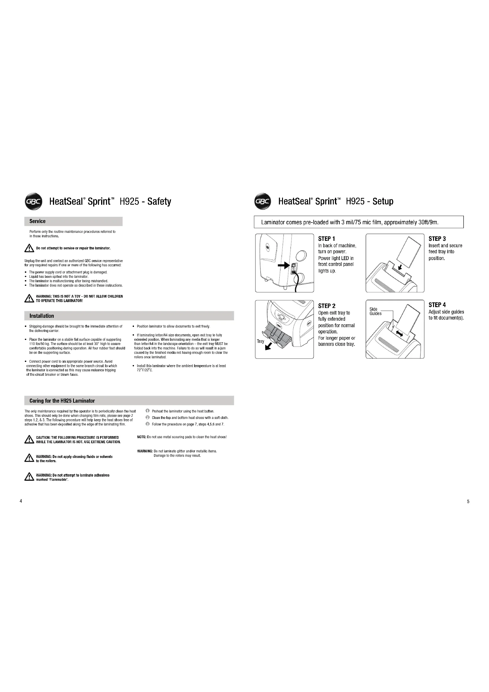 STEP 2 Open exit tray to fully extended position for normal operation. For longer paper or banners close tray. STEP 1 In back of machine, turn on power. Power light LED in front control panel lights up. STEP 4 Adjust side guides to fit document(s). STEP 3 Insert and secure feed tray into position. Side Guides Laminator comes pre-loaded with 3 mil/75 mic film, approximately 30ft/9m. HeatSeal Sprint H925 - Setup TM® Tray Perform only the routine maintenance procedures referred to in these instructions.The only maintenance required by the operator is to periodically clean the heat shoes. This should only be done when changing film rolls, please see page 7 steps 1,2, & 3. The following procedure will help keep the heat shoes free of adhesive that has been deposited along the edge of the laminating film.Preheat the laminator using the heat button.Clean the top and bottom heat shoes with a soft cloth.Follow the procedure on page 7, steps 4,5,6 and 7.Unplug the unit and contact an authorized GBC service representative for any required repairs if one or more of the following has occurred: Service Caring for the H925 Laminator Installation Do not attempt to service or repair the laminator.WARNING: THIS IS NOT A TOY - DO NOT ALLOW CHILDREN TO OPERATE THIS LAMINATOR!CAUTION: THE FOLLOWING PROCEDURE IS PERFORMED WHILE THE LAMINATOR IS HOT. USE EXTREME CAUTION.NOTE: Do not use metal scouring pads to clean the heat shoes!WARNING: Do not laminate glitter and/or metallic items. Damage to the rollers may result.WARNING: Do not apply cleaning fluids or solventsto the rollers.WARNING: Do not attempt to laminate adhesives marked ‘Flammable’.• The power supply cord or attachment plug is damaged.• Liquid has been spilled into the laminator.• The laminator is malfunctioning after being mishandled.• The laminator does not operate as described in these instructions.• Shipping damage should be brought to the immediate attention of the delivering carrier.• Place the laminator on a stable at surface capable of supporting 110 lbs/50 kg. The surface should be at least 30" high to assure comfortable positioning during operation. All four rubber feet should be on the supporting surface.• Connect power cord to an appropriate power source. Avoid connecting other equipment to the same branch circuit to which the laminator is connected as this may cause nuisance tripping of the circuit breaker or blown fuses.• Position laminator to allow documents to exit freely.• If laminating letter/A4 size documents, open exit tray to fully extended position. When laminating any media that is longer than letter/A4 in the landscape orientation – the exit tray MUST be folded back into the machine. Failure to do so will result in a jam caused by the finished media not having enough room to clear the rollers once laminated.• Install this laminator where the ambient temperature is at least 72