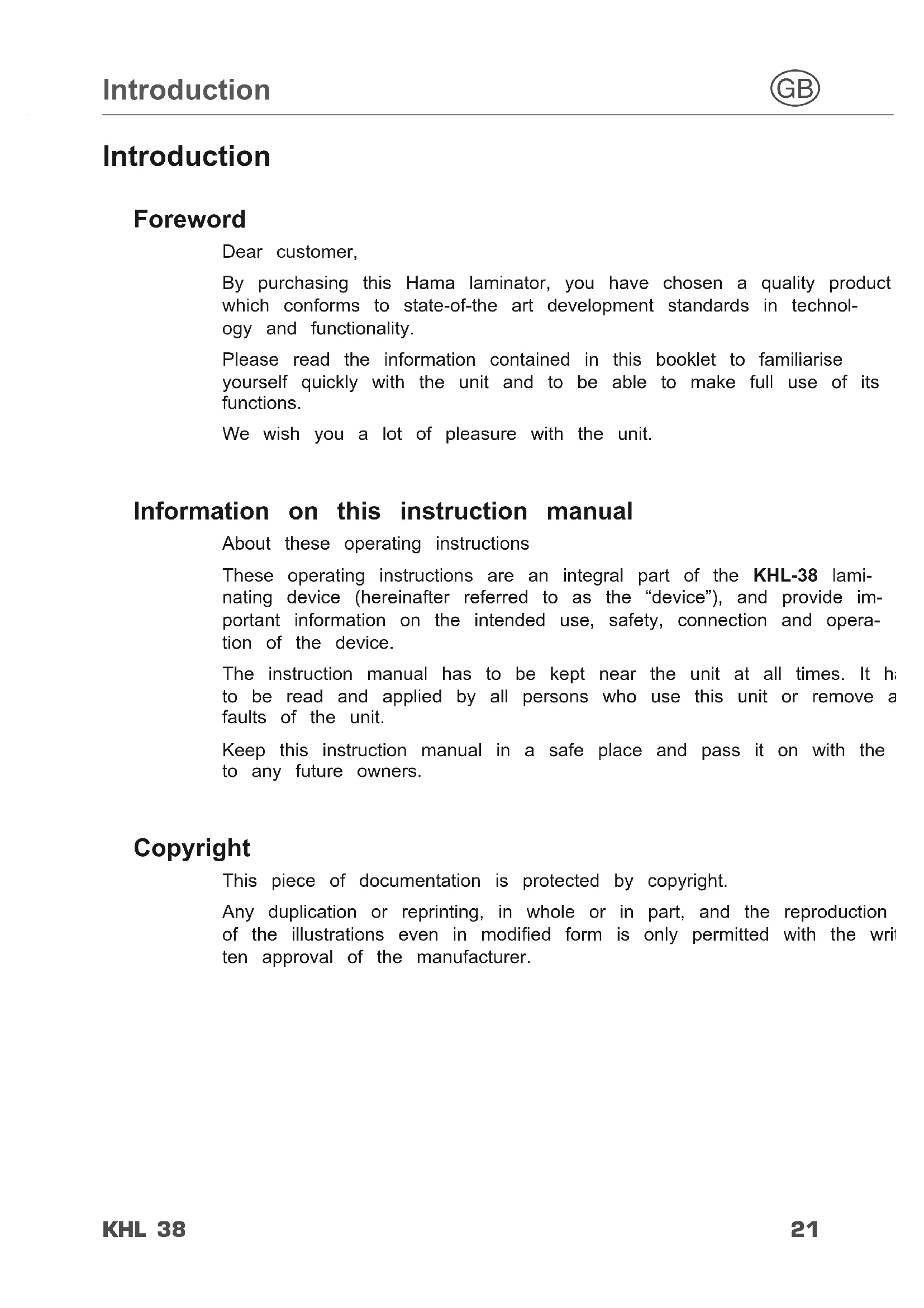 Introduction Foreword Dear customer, By purchasing this Hama laminator, you have chosen a quality product which conforms to state-of-the art development standards in technol- ogy and functionality. Please read the information contained in this booklet to familiarise yourself quickly with the unit and to be able to make full use of its functions. We wish you a lot of pleasure with the unit. Information on this instruction manual About these operating instructions These operating instructions are an integral part of the KHL-38 lami- nating device (hereinafter referred to as the “device”), and provide im- portant information on the intended use, safety, connection and opera- tion of the device. The instruction manual has to be kept near the unit at all times. It has to be read and applied by all persons who use this unit or remove any faults of the unit. Keep this instruction manual in a safe place and pass it on with the unit to any future owners. Copyright This piece of documentation is protected by copyright. Any duplication or reprinting, in whole or in part, and the reproduction of the illustrations even in modified form is only permitted with the writ- ten approval of the manufacturer.22 Introduction KHL 38