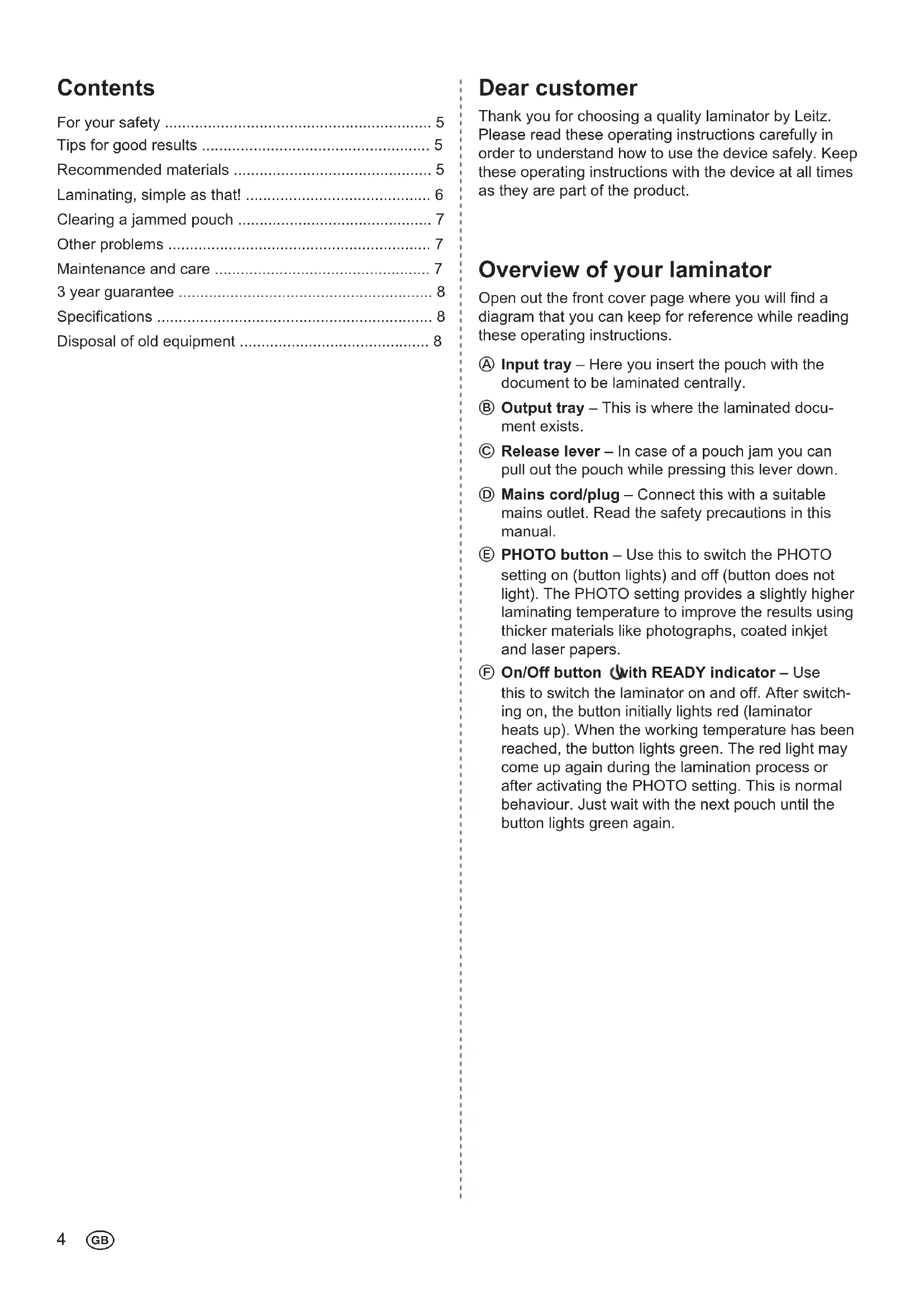 - Disposal of old equipment Dear customer Thank you for choosing a quality laminator by Leitz. Please read these operating instructions carefully in order to understand how to use the device safely. Keep these operating instructions with the device at all times as they are part of the product. p. 8